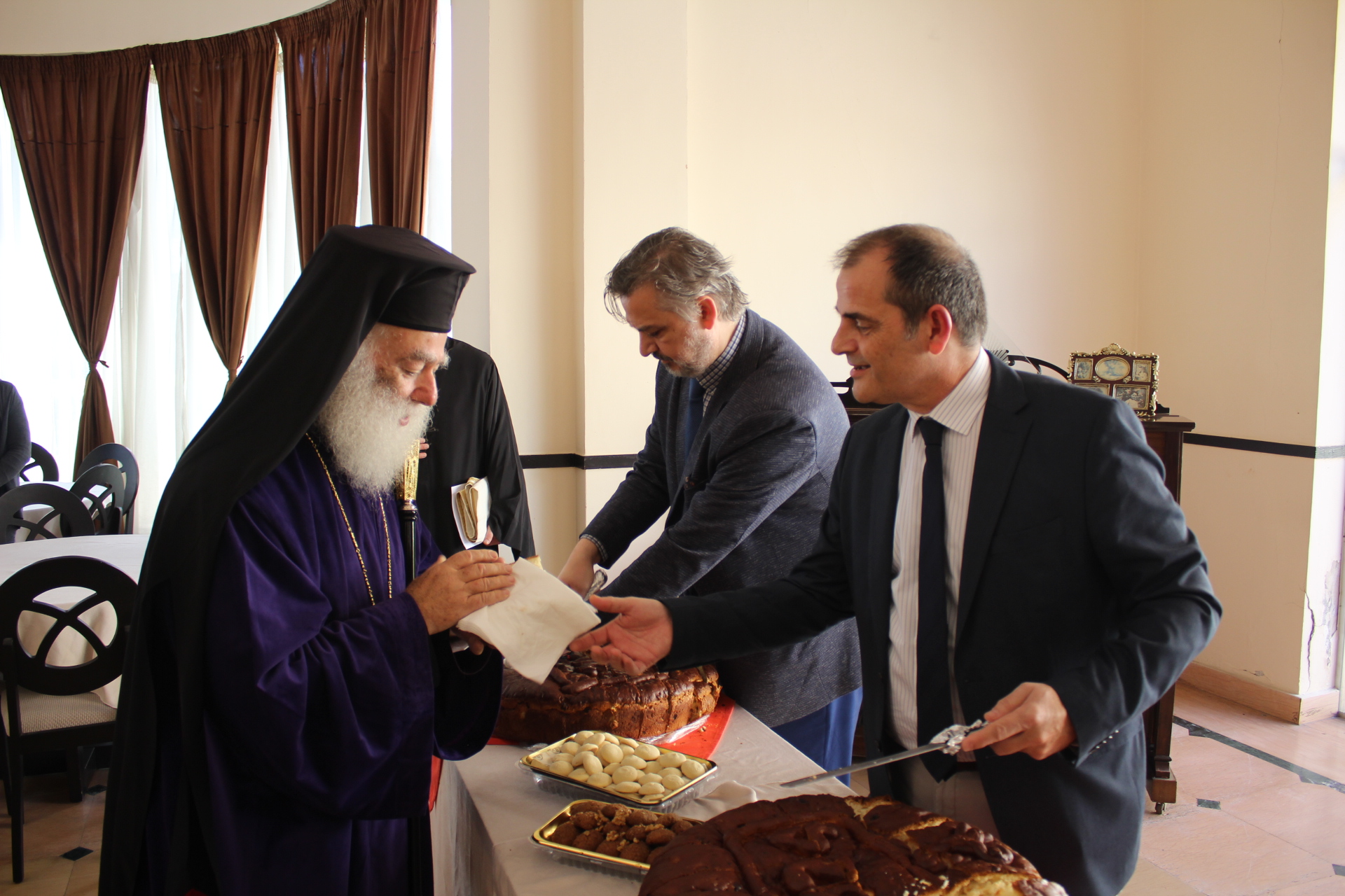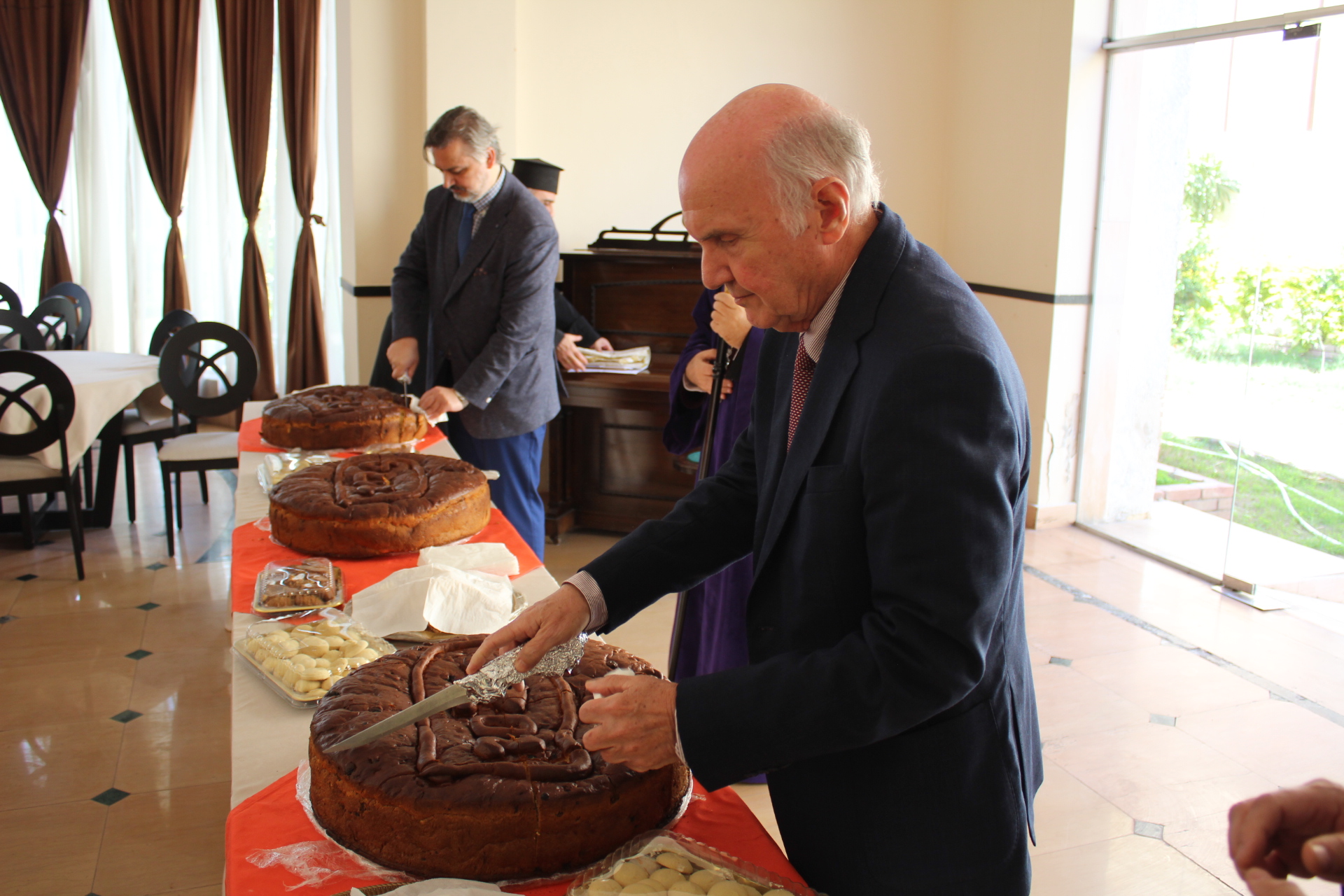 Και αφού σταύρωσε την πίτα και την ευλόγησε, παρέδωσε το μαχαίρι στον Πρόεδρο της Κοινότητας κ. Βαφειάδη, ο οποίος έκοψε ο πρώτο κομμάτι και το πρόσφερε στον Πατριάρχη ενώ στη συνέχεια ακολούθησαν: ο Γενικός Πρόξενος κ. Ιωάννης Πυργάκης, ο επίσημος προσκεκλημένος κ. Τάκης Αράπογλου και οι θεσμικοί εκπρόσωποι της Ε.Κ.Α. ο Αντιπρόεδρος κ. Ιωάννης Παπαδόπουλος, ο Οικονομικός Επόπτης κ. Ιωάννης Τατάκης και ο Γενικός Γραμματέας κ. Νικόλαος Κατσιμπρής.