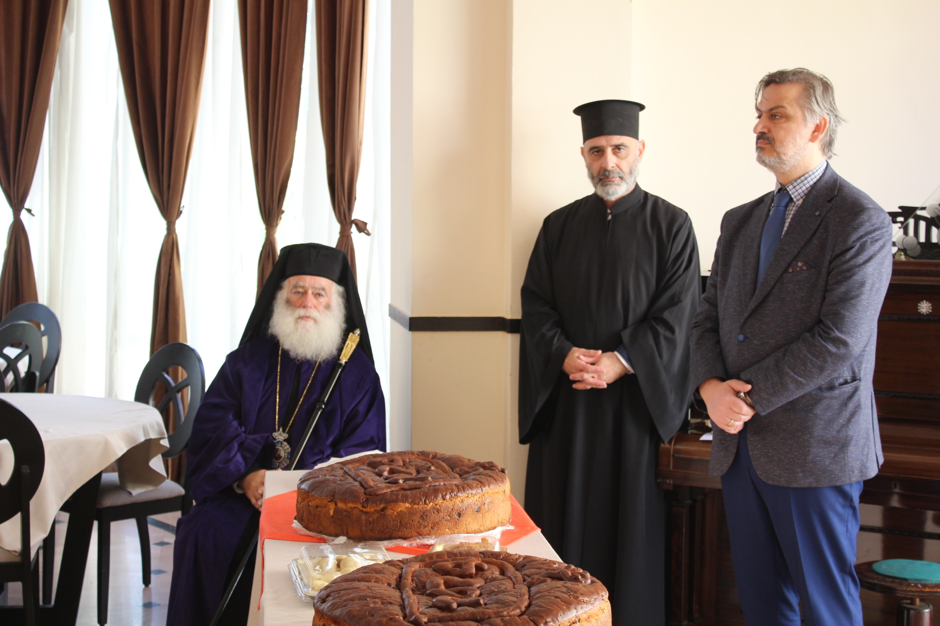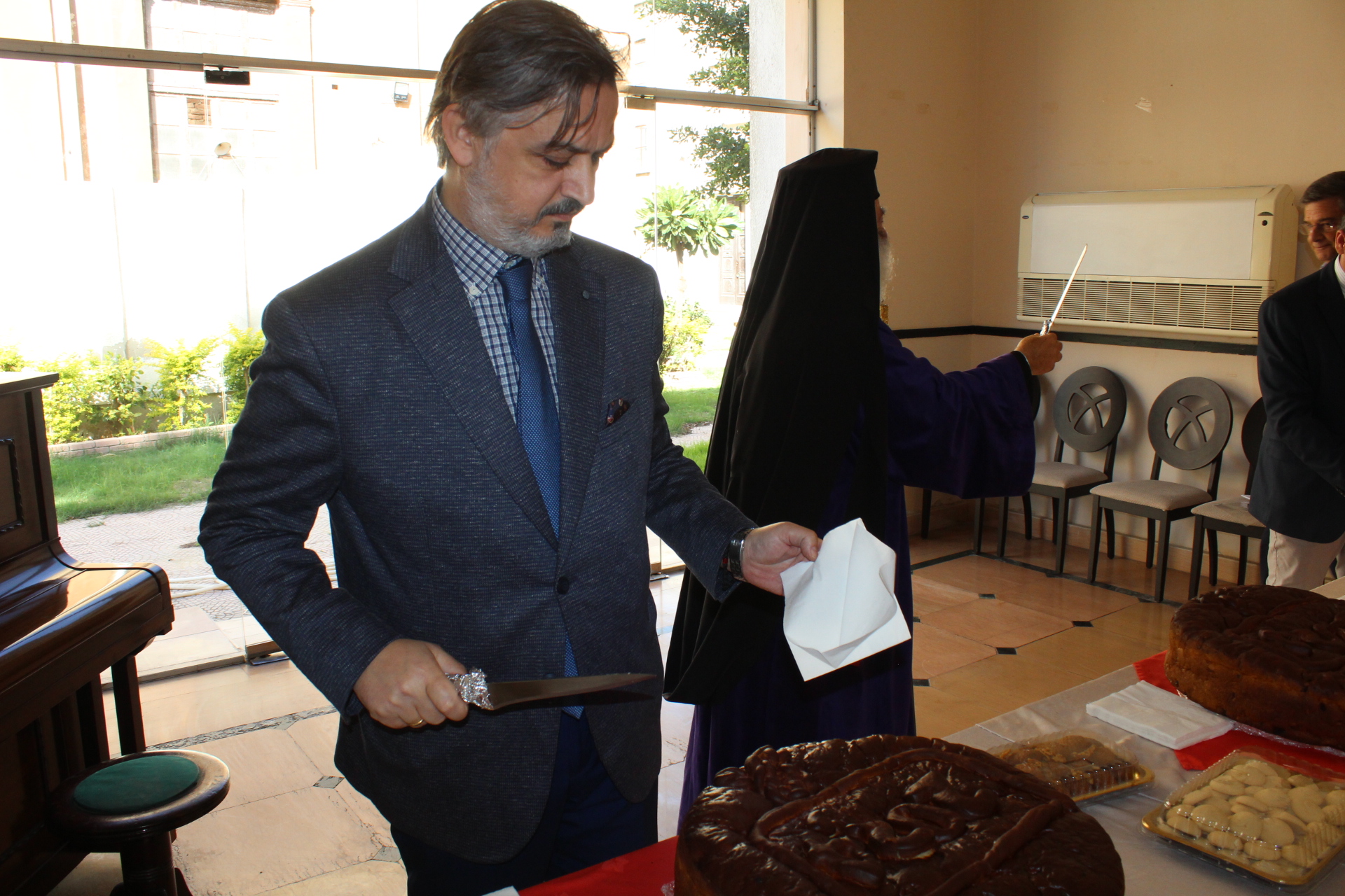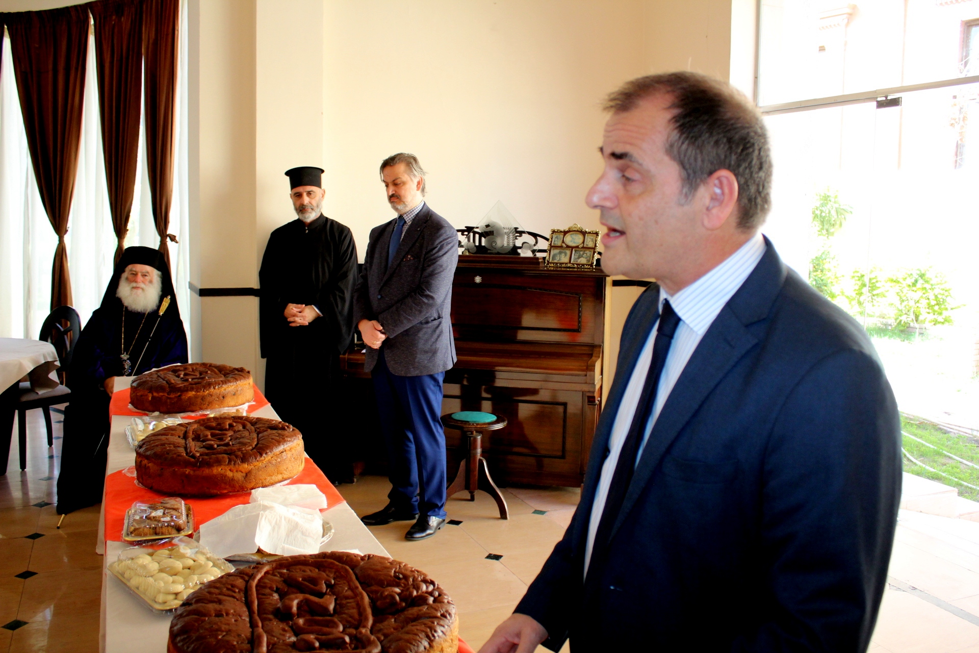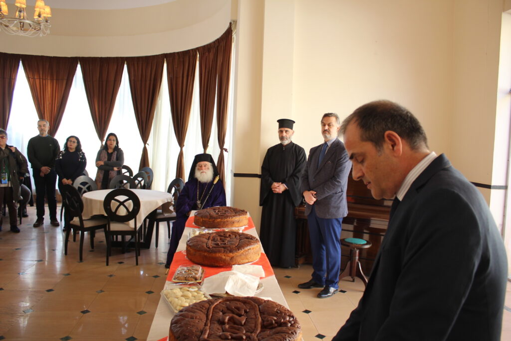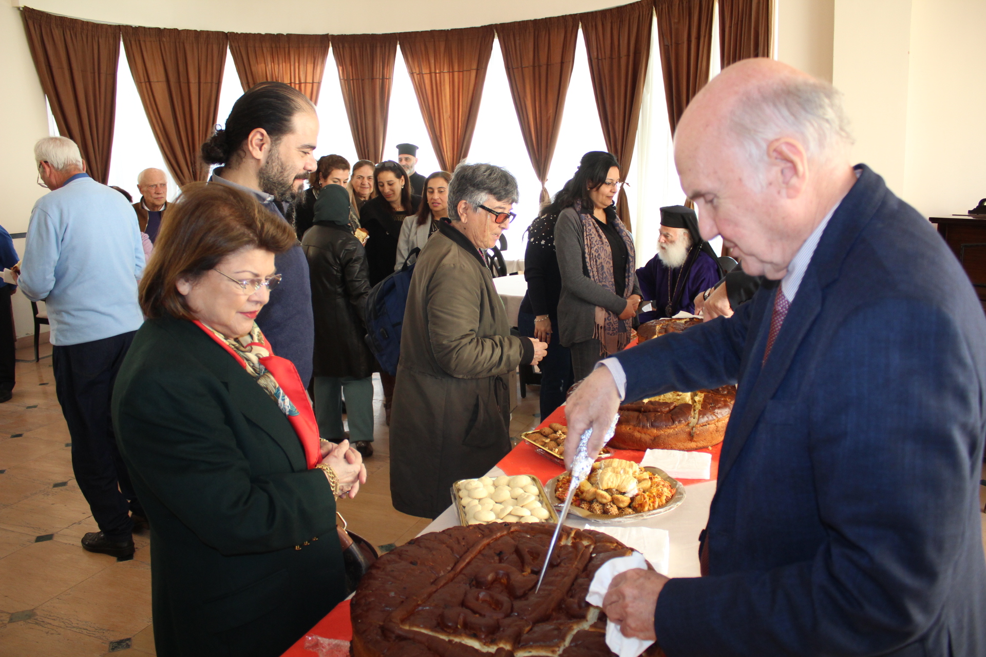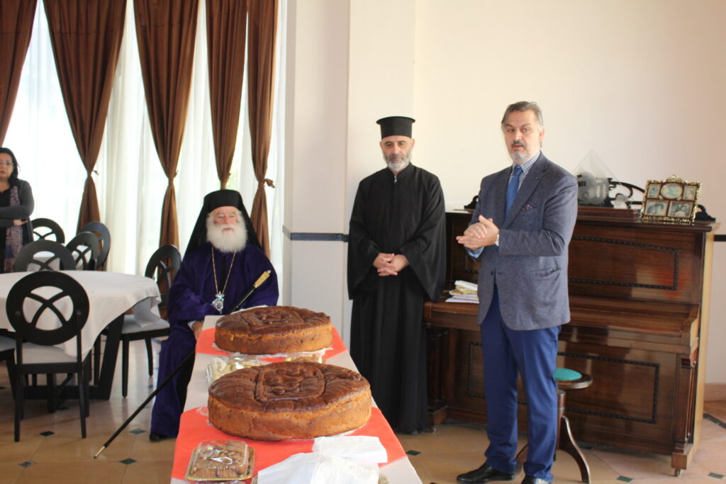 Στην Τελετή της Αγιοβασιλόπιτας παρευρέθησαν οι Καϊρινοί κ. Γιώργος Ζουμπουλίδης, Πρόεδρος του Ορθόδοξου Πατριαρχικού Κέντρου Σούμπρας, μετά της συζύγου του κ. Μαρίνας Χέλμη του προσωπικού της Πρεσβείας του Καΐρου.