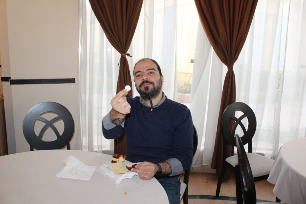 Μετά από όλα αυτά ο Μακαριώτατος ύψωσε το μαχαίρι και με το γνωστό του χιούμορ απευθυνόμενος στον επιχειρηματία κ. Γιώτη τον προέτρεψε να επιβραβεύσει τον τυχερό που θα εύρει το φλουρί, με τον εφοδιασμό του επί ένα χρόνο με τα προϊόντα της πασίγνωστης βιομηχανίας του. Προς δε τον κ. Αράπογλου χαριτολογώντας του πρότεινε: «Εσύ φίλε Τάκη τον τυχερό της άλλης πίτας να τον ανταμείψεις με επιταγές».