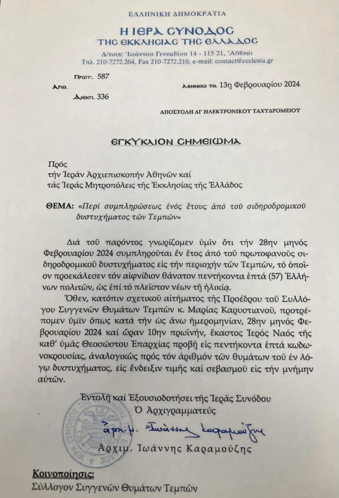 Σε κλίμα οδύνης και θέλοντας να τιμήσει την μνήμη των 57 νεκρών, η Εκκλησία της Ελλάδος, χτύπησε σήμερα πένθιμα τις καμπάνες 57 φορές, μία φορά για κάθε ένα θύμα που έχασε τη ζωή του στο τρένο της Hellenic Train.