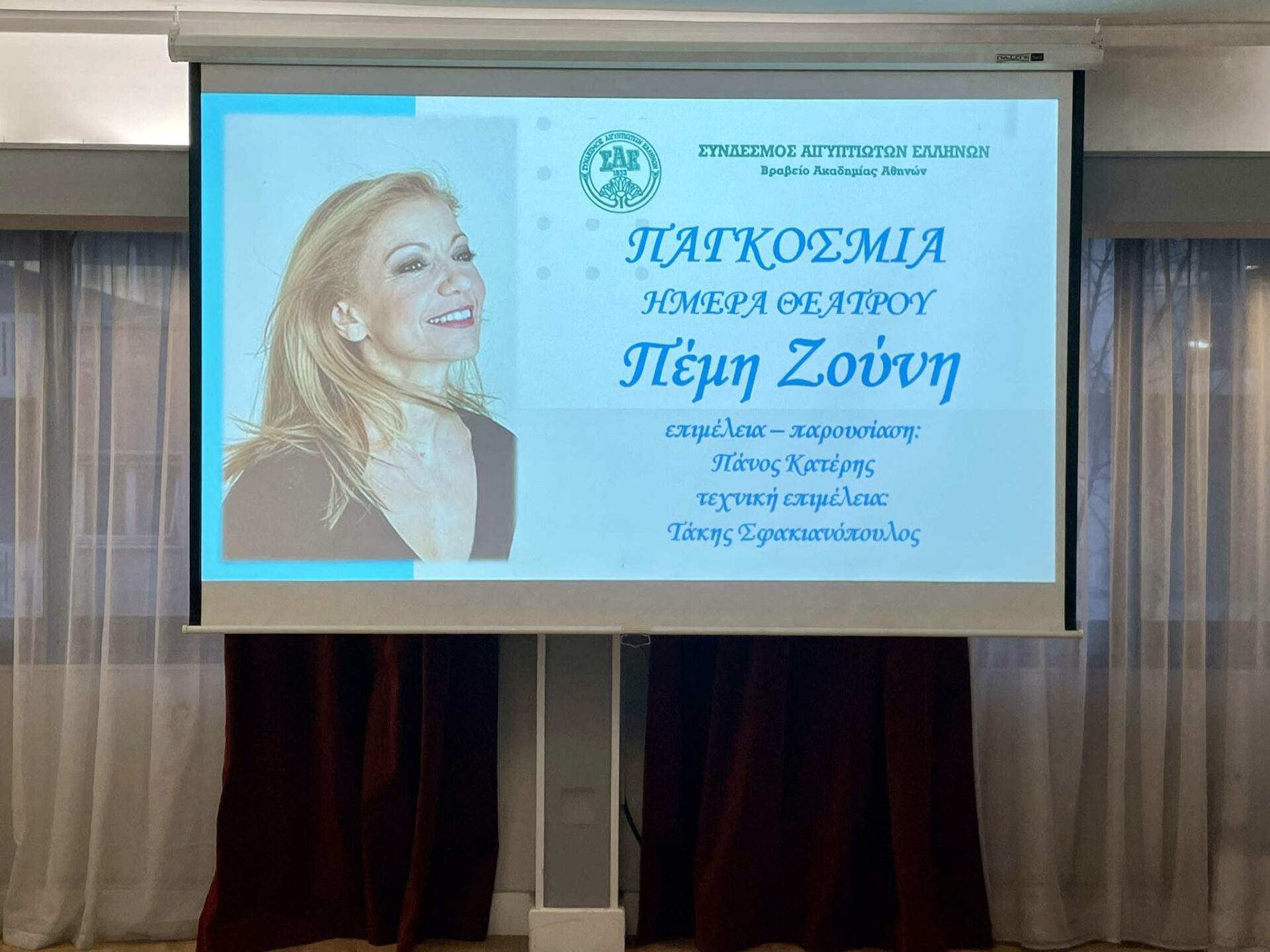 Τη Δευτέρα 11 Μαρτίου 2024 πραγματοποιήθηκε στο εντευκτήριο του Συνδέσμου Αιγυπτιωτών Ελλήνων εκδήλωση αφιερωμένη στην Παγκόσμια Ημέρα Θεάτρου. Η εκδήλωση αυτή για τον Σύνδεσμο είναι πια θεσμός, αφού καθιερώθηκε εδώ και 32 χρόνια, οπότε την είχε προτείνει και πραγματοποιήσει επί σειρά ετών ο αείμνηστος καθηγητής – φιλόλογος Παναγιώτης Καρματζός.