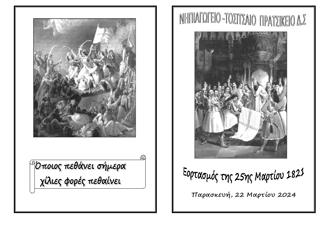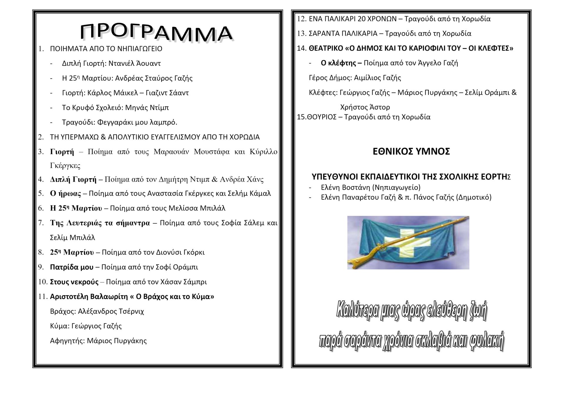 Από το Νηπιαγωγείο και το Τοσιτσαίο – Πρατσίκειο Δημοτικό, υπεύθυνοι της Σχολικής Εορτής ήταν: η Δ/ντρια του Νηπιαγωγείου κα. Ελένη Βοστάνη και από το Δημοτικό η κα. Ελένη Παναρέτου Γαζή και ο κ. Πάνος Γαζής.