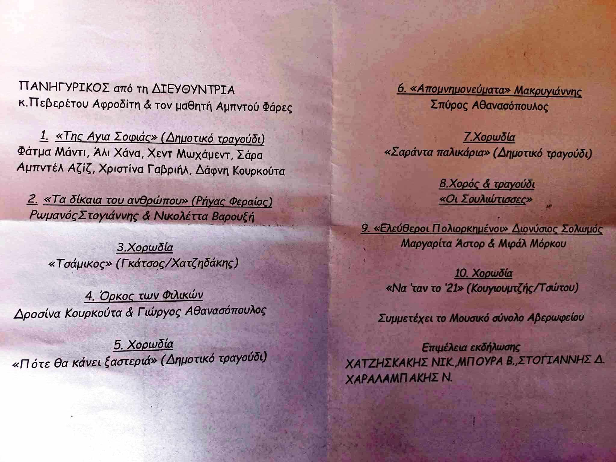 Άλλωστε σε τι να πρωτοαναφερθείς; Στους μπόμπιρες του Νηπιαγωγείου και το παιδικό χαμόγελό τους; Στα παιδιά του Δημοτικού με τις χορωδίες και τις απαγγελίες τους; Στους μεγαλύτερους του Αβερωφείου για τους χορούς τους, τα αποσπάσματά τους και τις μουσικές πανδαισίες τους;