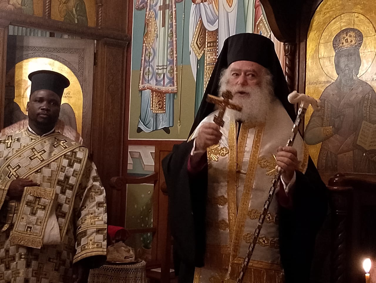 Συμπροσευχόμενοι μετά του Μακαριωτάτου, ο Σεβασμιώτατος Μητροπολίτης Πηλουσίου κ. Νάρκισσος, Πατριαρχικός Επίτροπος και ο Σεβασμιώτατος Μητροπολίτης Ταμιάθεως κ. Γερμανός Προϊστάμενος της Ιεράς Μονής του Οσίου Σάββα του Ηγιασμένου.