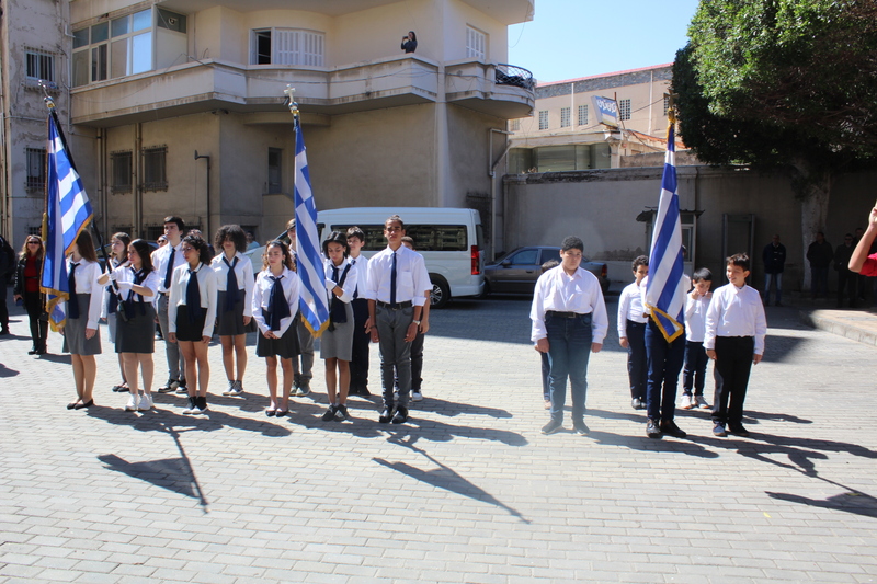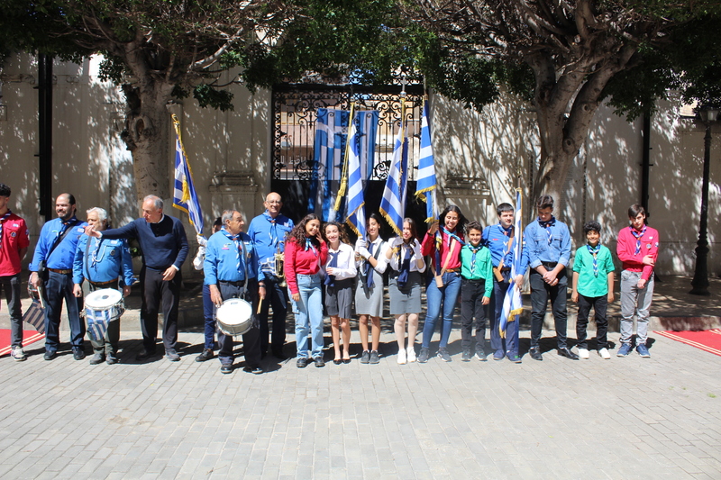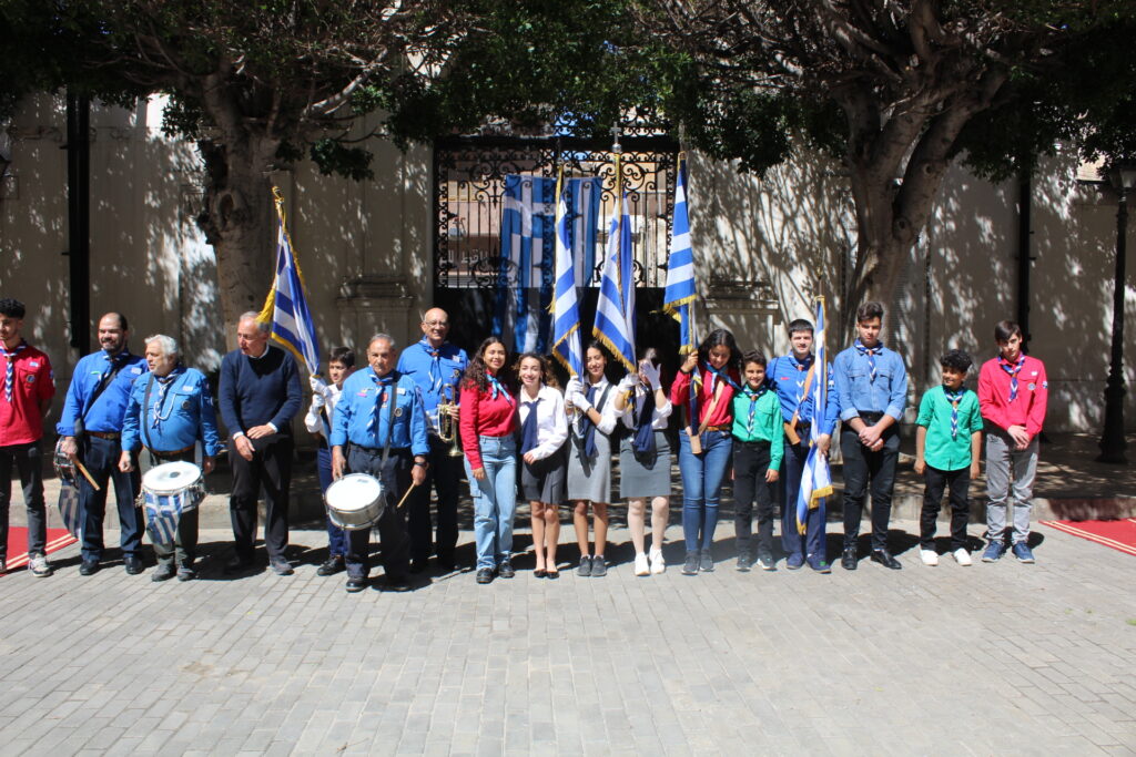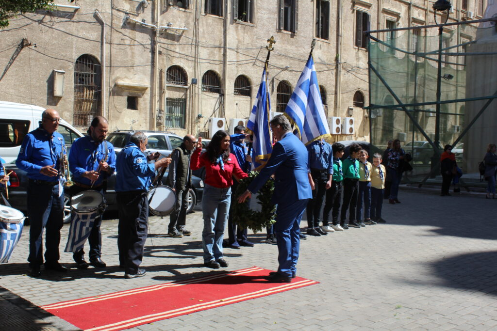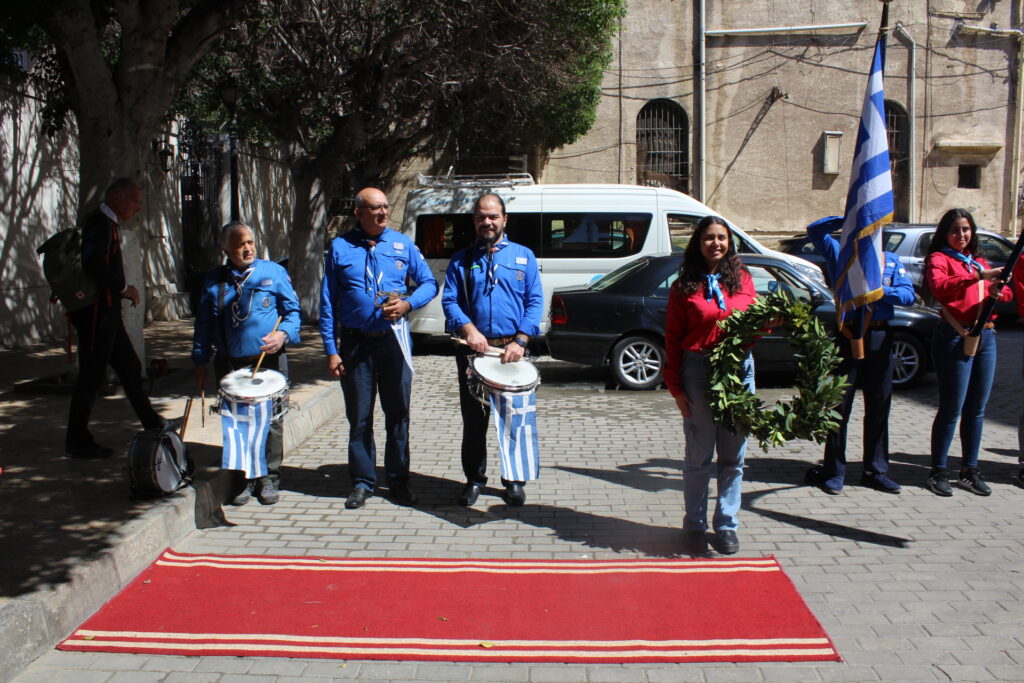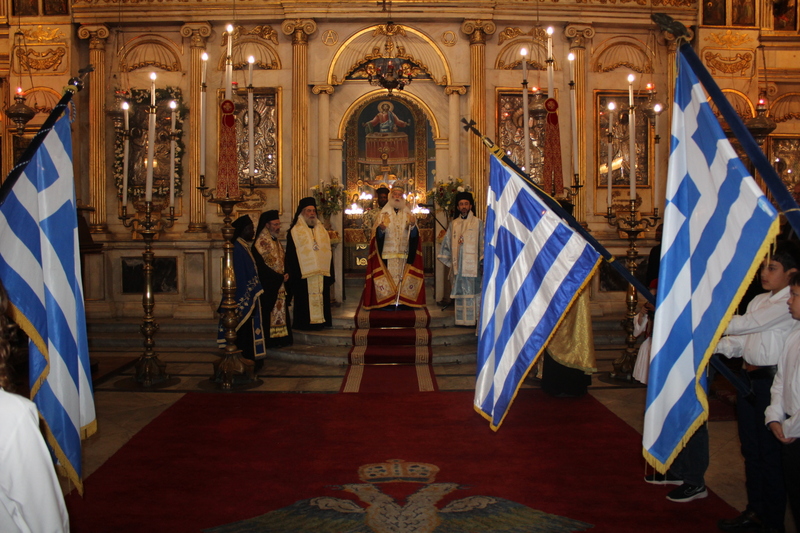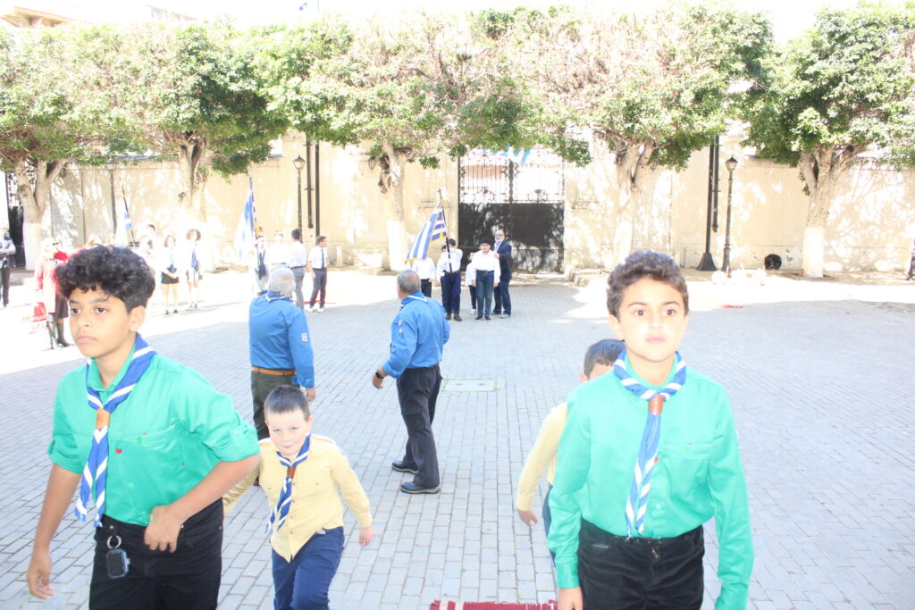 Μετά την ολοκλήρωση της Δοξολογίας εξήλθαν άπαντες του Ιερού Ναού όπου εκεί οι μαθητές των Σχολείων και οι Πρόσκοποι με την μπάντα τους προεξαρχόντων των βαθμοφόρων τους κ. Άρη Μαρκοζάνη, κ. Τζόνι Μύρου, κ. Ριάντ και του Διευθυντή της ΕΚΑ κ. Γεωργίου Μπούλου, έπαιξαν τους Εθνικούς Ύμνους Ελλάδος και Αιγύπτου, με το σύνολο των εκκλησιαζομένων να παρευρίσκεται στα σκαλοπάτια του Ευαγγελισμού σε στάση προσοχής.