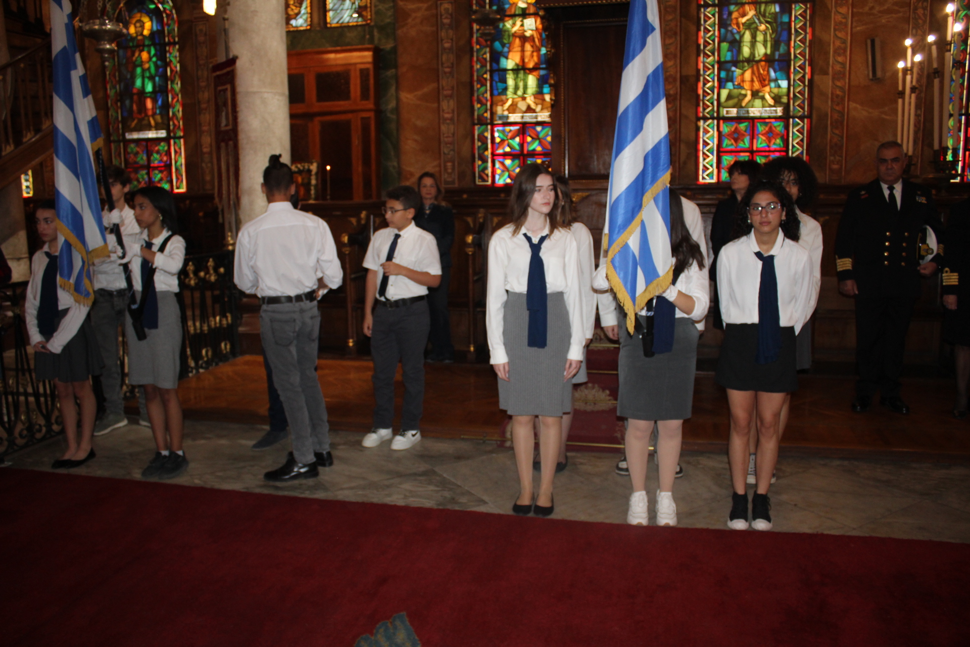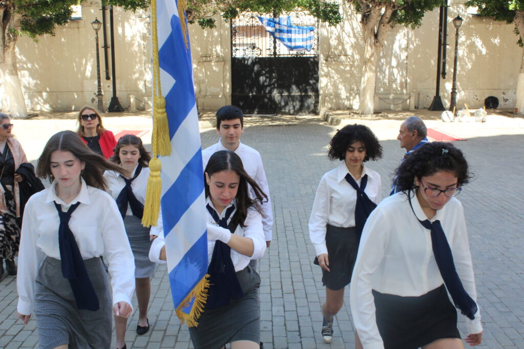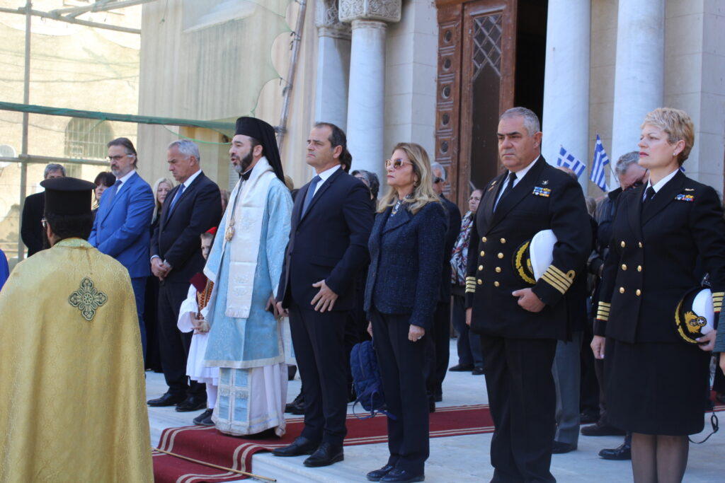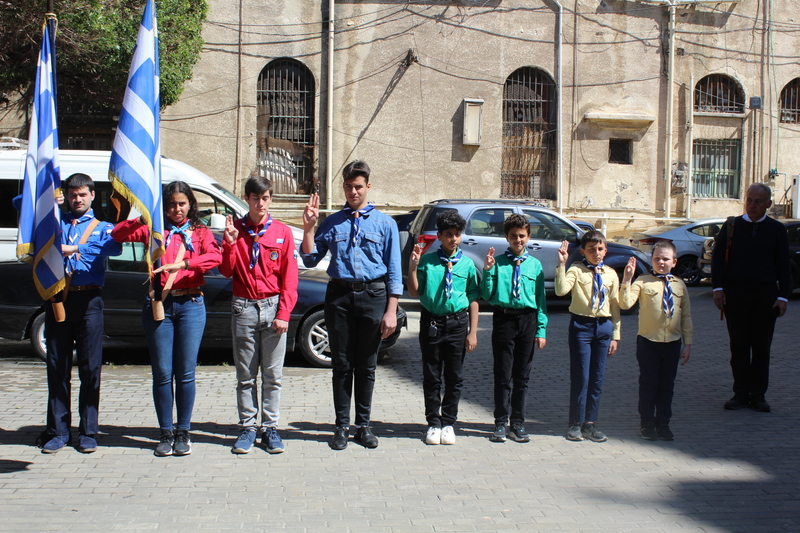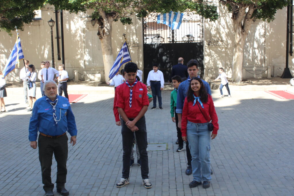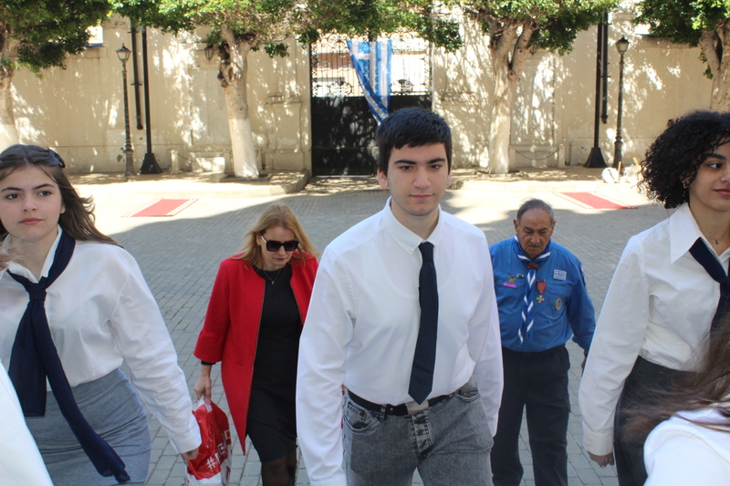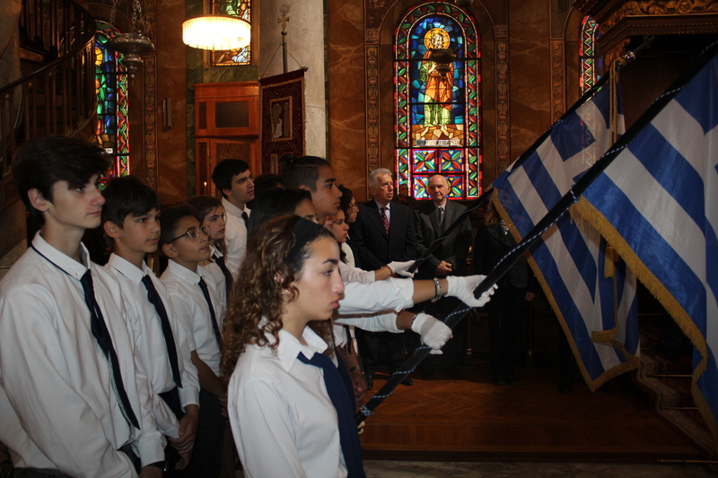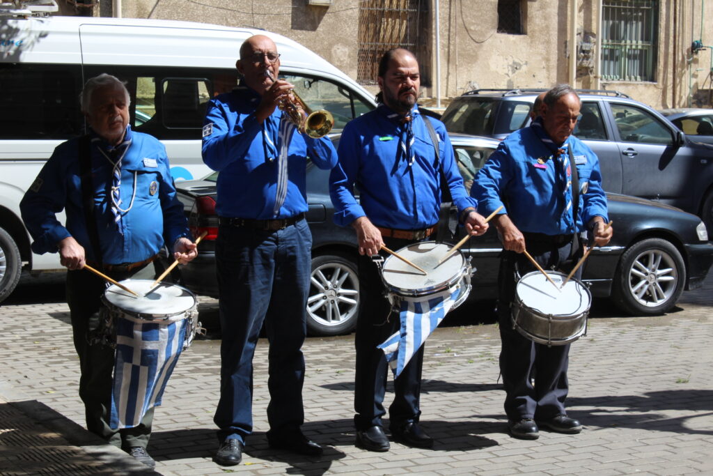 Μετά την ολοκλήρωση της Δοξολογίας εξήλθαν άπαντες του Ιερού Ναού όπου εκεί οι μαθητές των Σχολείων και οι Πρόσκοποι με την μπάντα τους προεξαρχόντων των βαθμοφόρων τους κ. Άρη Μαρκοζάνη, κ. Τζόνι Μύρου, κ. Ριάντ και του Διευθυντή της ΕΚΑ κ. Γεωργίου Μπούλου, έπαιξαν τους Εθνικούς Ύμνους Ελλάδος και Αιγύπτου, με το σύνολο των εκκλησιαζομένων να παρευρίσκεται στα σκαλοπάτια του Ευαγγελισμού σε στάση προσοχής.