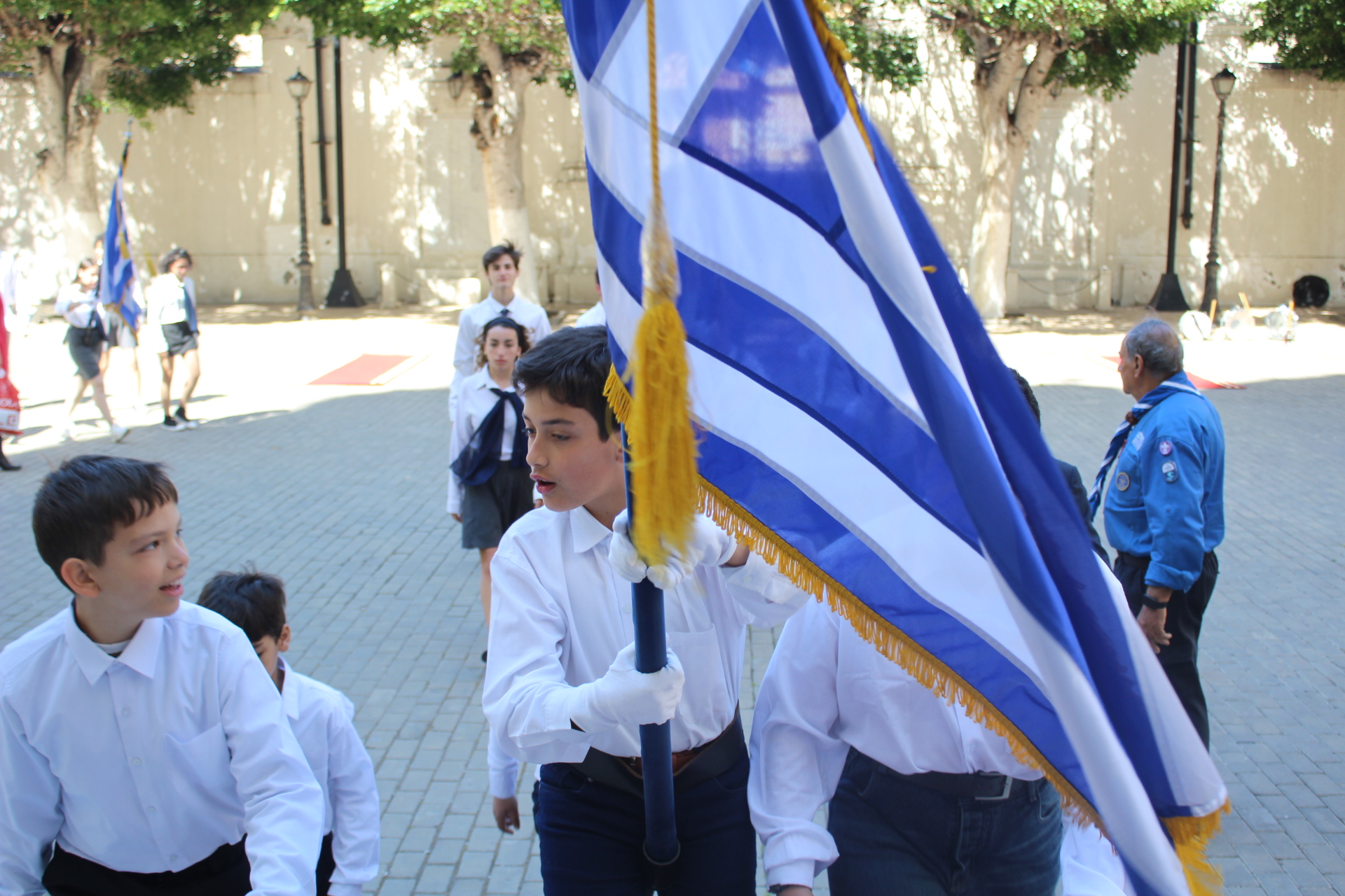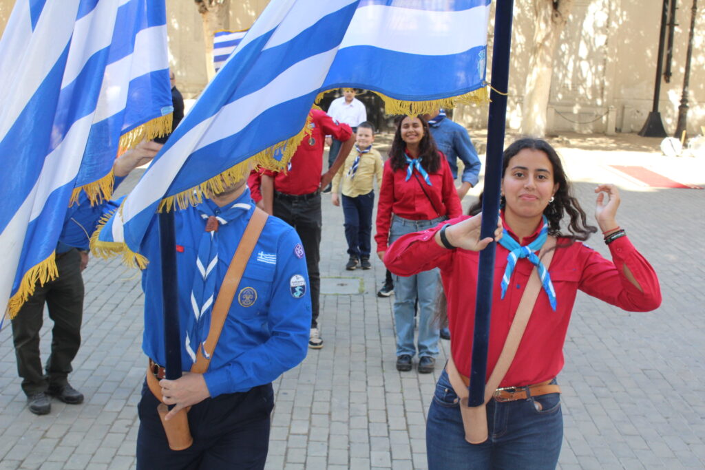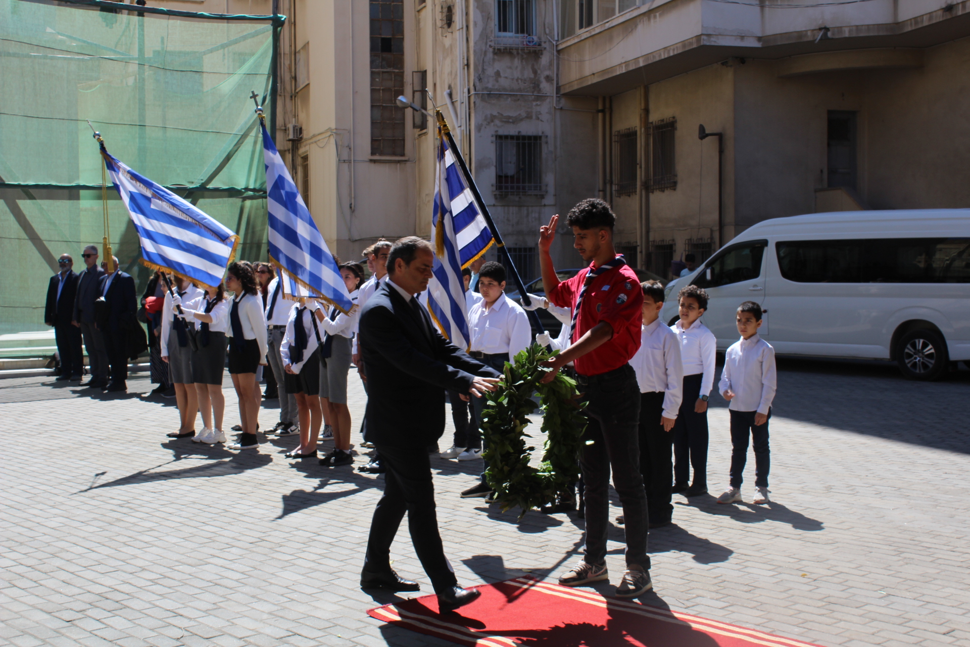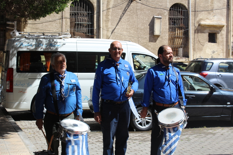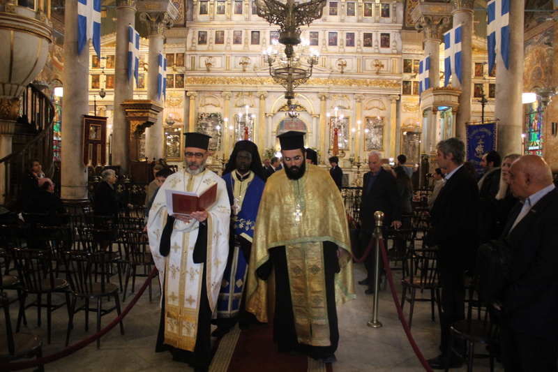 Μετά την ολοκλήρωση της Δοξολογίας εξήλθαν άπαντες του Ιερού Ναού όπου εκεί οι μαθητές των Σχολείων και οι Πρόσκοποι με την μπάντα τους προεξαρχόντων των βαθμοφόρων τους κ. Άρη Μαρκοζάνη, κ. Τζόνι Μύρου, κ. Ριάντ και του Διευθυντή της ΕΚΑ κ. Γεωργίου Μπούλου, έπαιξαν τους Εθνικούς Ύμνους Ελλάδος και Αιγύπτου, με το σύνολο των εκκλησιαζομένων να παρευρίσκεται στα σκαλοπάτια του Ευαγγελισμού σε στάση προσοχής.