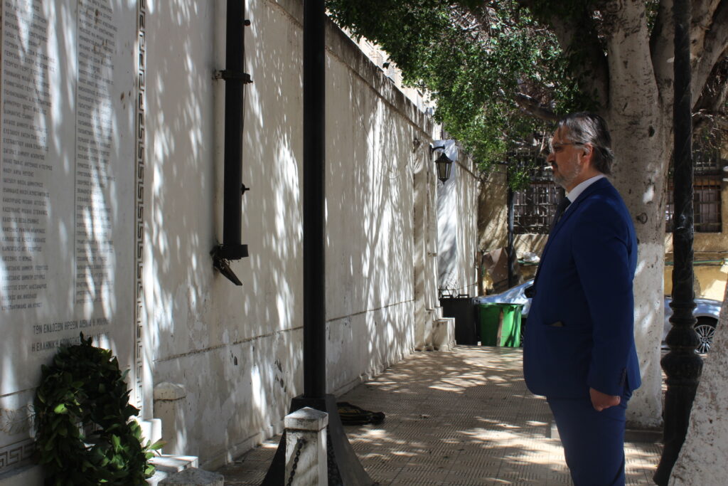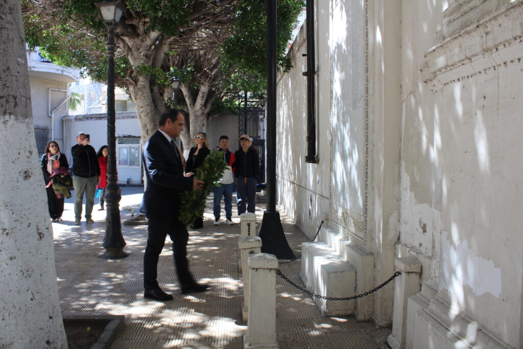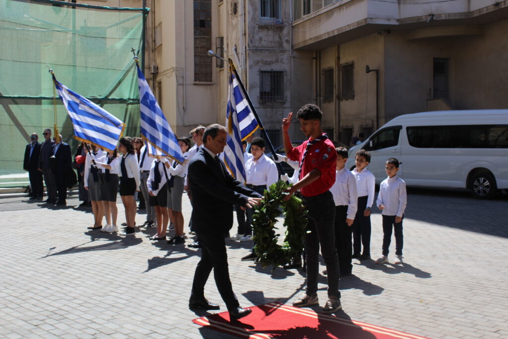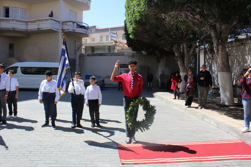 Ακολούθησαν οι καταθέσεις δύο στεφάνων στα ιστορικά Μνημεία, με τη γαλανόλευκη να κυματίζει υπό τη συνοδεία των τυμπάνων της προσκοπικής μπάντας, από τον Γενικό Πρόξενο κ. Ιωάννη Πυργάκη και τον Πρόεδρο της Ελληνικής Κοινότητας Αλεξανδρείας κ. Ανδρέα Βαφειάδη, σε μια στιγμή άκρως συγκινητική για όλους τους παρευρισκόμενους.