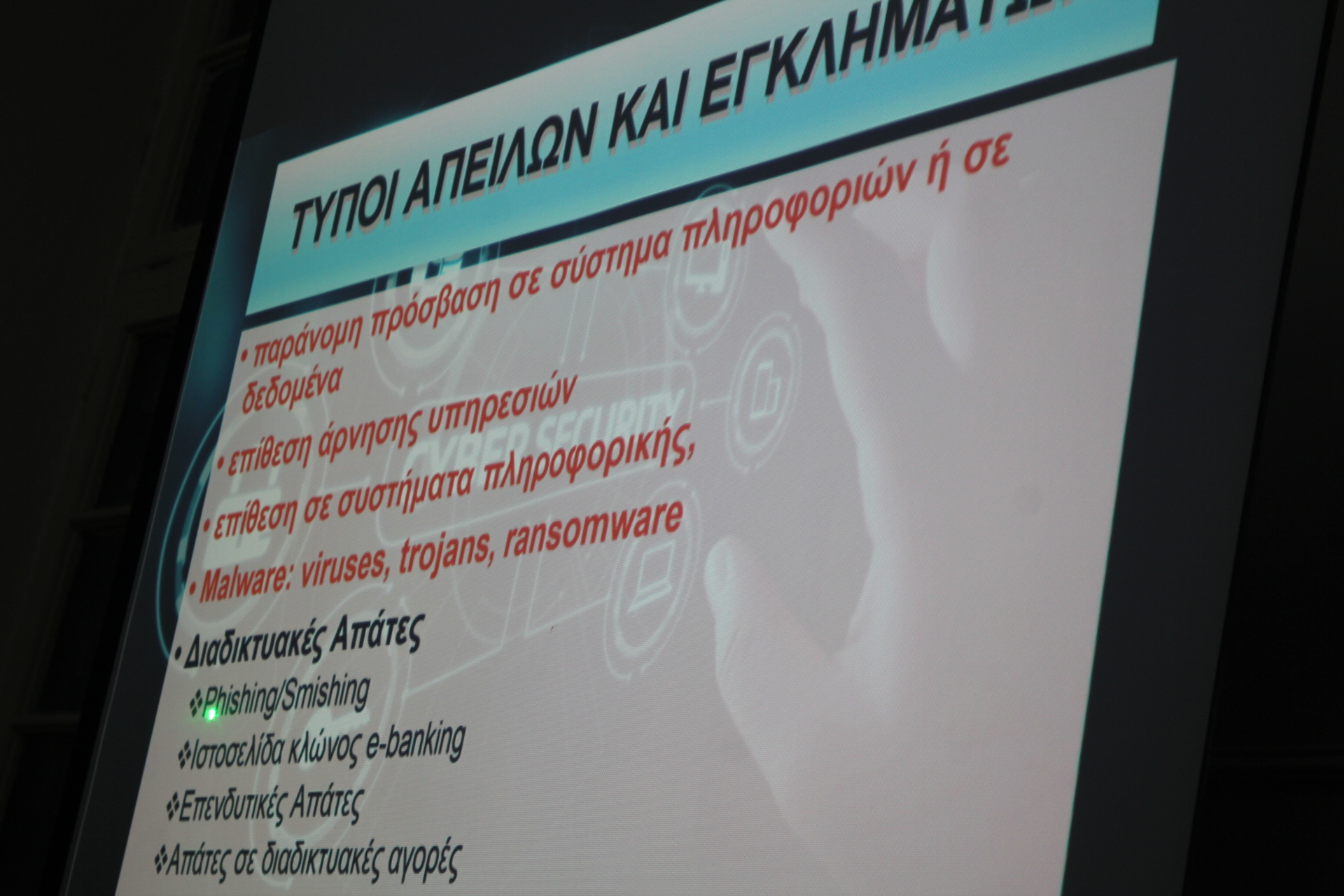 Κυρίως όμως συγχαίρει του δύο παρουσιαστές, τον Πλοίαρχο του Ελληνικού Πολεμικού Ναυτικού και Σύνδεσμο με το Αιγυπτιακό κ. Κωνσταντίνο Βαρουξή και τον εκπαιδευτικό μαθηματικό του Αβερωφείου Γυμνασίου – Λυκείου κ. Παναγιώτη Θεοδώρου, για την ανιδιοτελή προσφορά τους να επιμορφώσουν το παριστάμενο κοινό, σχετικά με τον μεγάλο κίνδυνο που αντιμετωπίζουν οι ιντερνετικοί χρήστες με τις «Απάτες στο Διαδίκτυο».