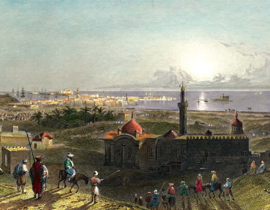 Η πόλη τής Αλεξάνδρειας όπως ήταν την εποχή τής εγκατάστασης τού Μιχαήλ Τοσίτσα. Χαλκογραφία τού Ουίλλιαμ Μπάρλετ, 1840.