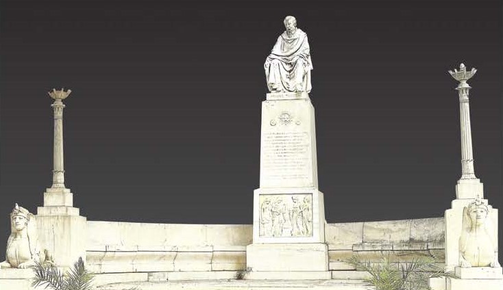 Το μνημείο του είναι ένα από τα μεγαλύτερα τής Ελλάδας και είναι ακριβώς δίπλα στην εκκλησία τού Αγίου Λαζάρου στο Α΄ Νεκροταφείο στην Αθήνα. Είναι έργο των Τηνίων γλυπτών Γεώργιου και Λάζαρου Φυτάλη. Ο αδριάντας τού ευεργέτη είναι σε φυσικό μέγεθος και βρίσκεται τοποθετημένος σε ψηλή βάση. Το κάτω τμήμα τής βάσης κοσμείται από ενα αρχαιοπρεπές ανάγλυφο το οποίο απεικονίζει 4 γυναικείες μορφές προσωποποιήσεις των πόλεων Αθήνας, Αλεξάνδρειας, Μετσόβου και ίσως Θεσσαλονίκης, οι οποίες θρηνούν γύρω από την τεφροδόχο. Τα δύο άκρα τής σύνθεσης απολήγουν σε δύο αγάλματα όμοια με τη Σφίγγα τής Αιγύπτου.
