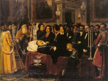 «Ο θάνατος τού Μιχαήλ Τοσίτσα», πίνακας τού Ζακυνθινού ζωγράφου Διονυσίου Τσόκου. Η Ελένη Τοσίτσα, με τα χέρια σταυρωμένα, στέκεται πάνω από τον νεκρό σύζυγό της. Αριστερά στέκεται ο Αρχιεπίσκοπος Νεόφυτος, δεξιά ο πρωθυπουργός Δημήτρης Βούλγαρης, δίπλα του, πίσω από το κηροπήγιο, ο Γεώργιος Σταύρου. Η μορφή με το χέρι στο πηγούνι είναι ο ίδιος ο Δ. Τσόκος.
