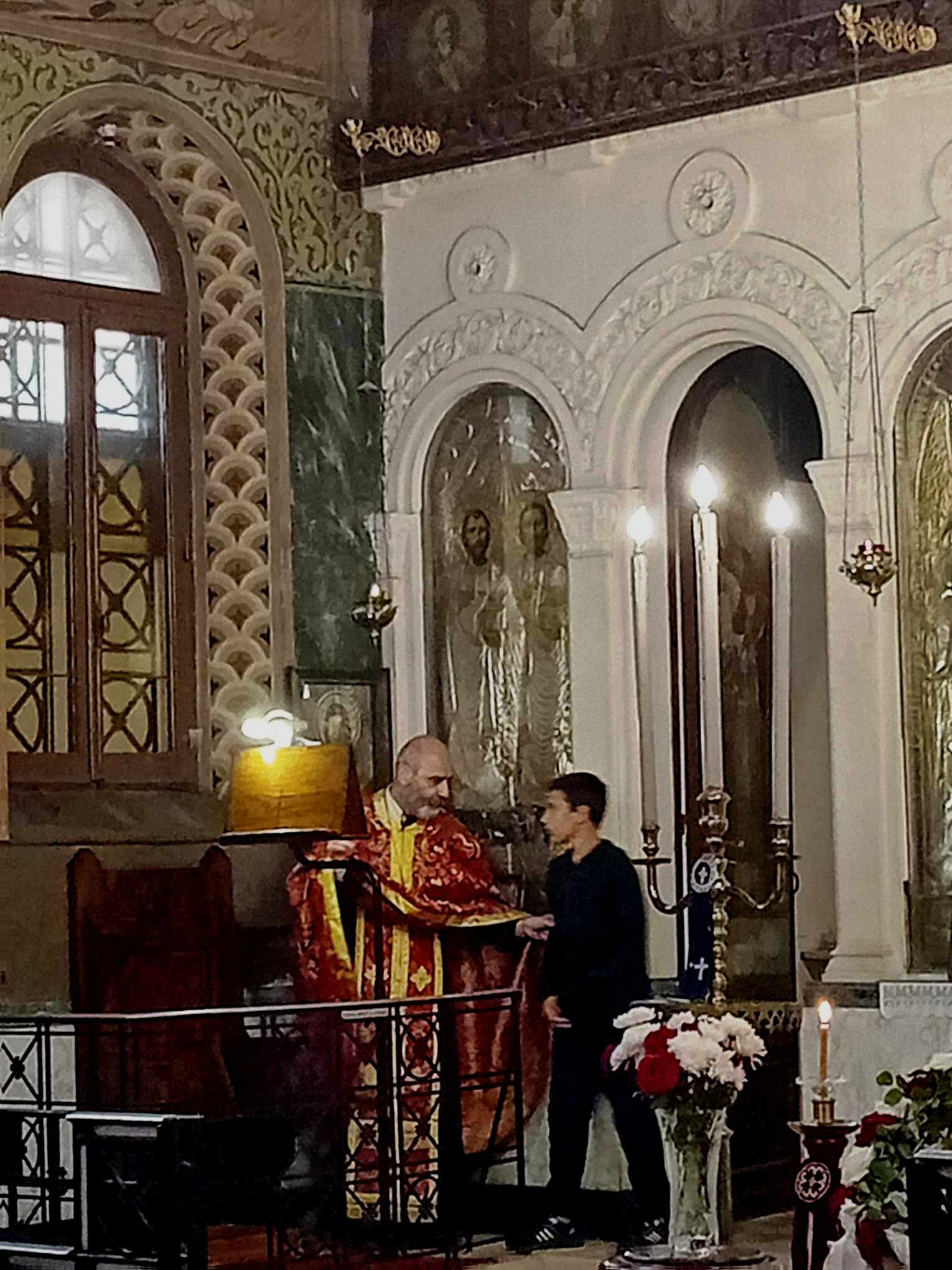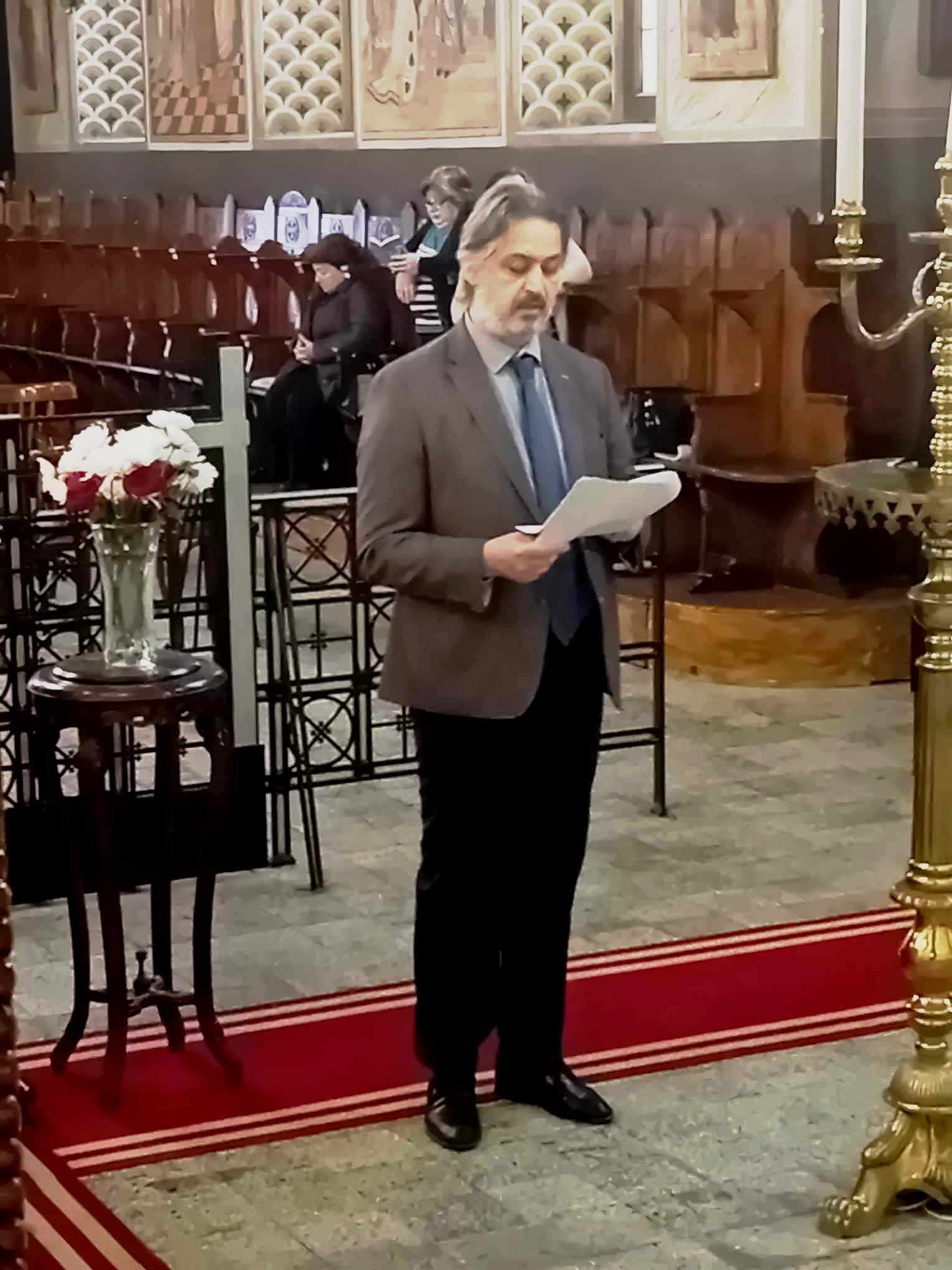 Καλωσόρισε τον Γενικό Πρόξενο που για πρώτη φορά ήρθε να εκκλησιαστεί στην Ιερό Ναό των Ταξιαρχών, τον ευχαρίστησε που λάμπρυνε με τη μελωδική φωνή του την όλη ακολουθία και του ευχήθηκε καλή δύναμη στο έργο του.