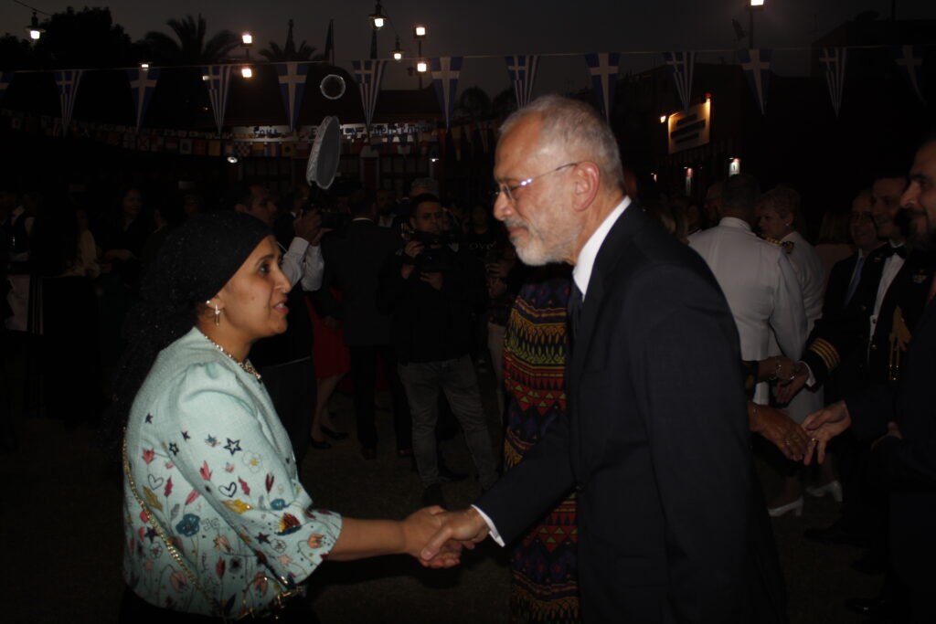 Η δεσπόζουσα μορφή της επίσημης προσκεκλημένης Αιγυπτίας Υπουργού Μετανάστευσης και Διασποράς κας Σόχα Ελ Γκέντι στο βήμα, απέδειξε για μια ακόμη φορά, εκτός των άριστων σχέσεων μεταξύ των δύο χωρών μας και τον προσωπικό της φιλελληνισμό! Συγκίνησε ιδιαιτέρως το ακροατήριο αναφερόμενη στη χαρά που εισπράττει για την παρουσία της στην δεξίωση της Ελληνικής Πρεσβείας, που τιμά την απελευθέρωση των Ελλήνων.