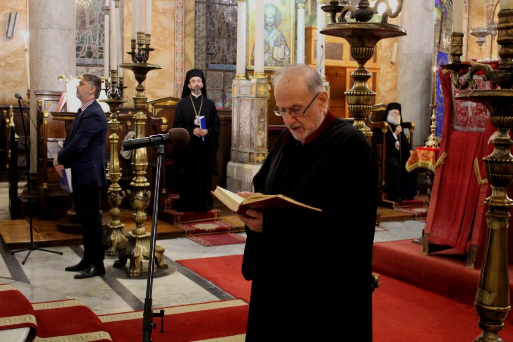Μαζί του συμπροσευχόταν ο Σεβασμιώτατος Μητροπολίτης Πτολεμαΐδος κ. Παντελεήμονας Αρχιγραμματέας της Ιεράς Συνόδου και ο Πανοσιολογιότατος Αρχιμανδρίτης κ. Φιλάρετος.