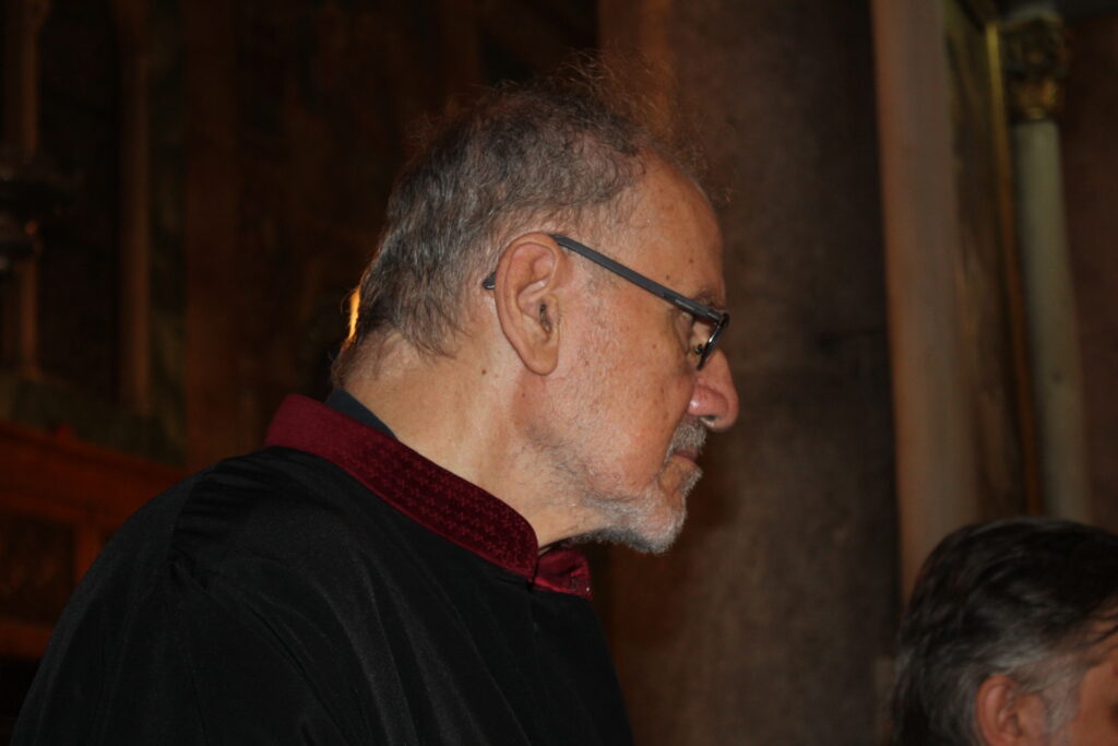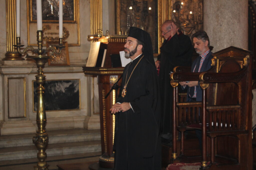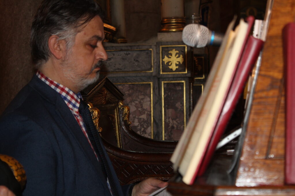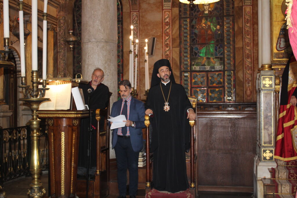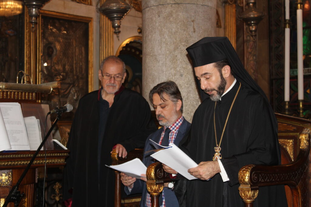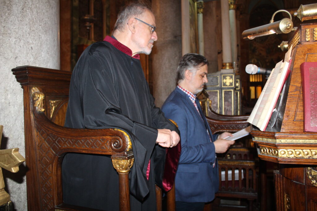 Οι δύο καλλικέλαδοι ιεροψάλτες, ο Γενικός Πρόξενος κ. Ιωάννης Πυργάκης που προσφέρει τα μάλα με τη διττή ιδιότητα διπλωμάτη και ιεροψάλτη και ο έτερος εκφραστής της βυζαντινής μελωδίας και συνάμα εκπαιδευτικός κ. Αλέξανδρος Μπάσης, απέδωσαν με φωνητική δεινότητα και ιερότητα το τελετουργικό του Ακάθιστου ύμνου!