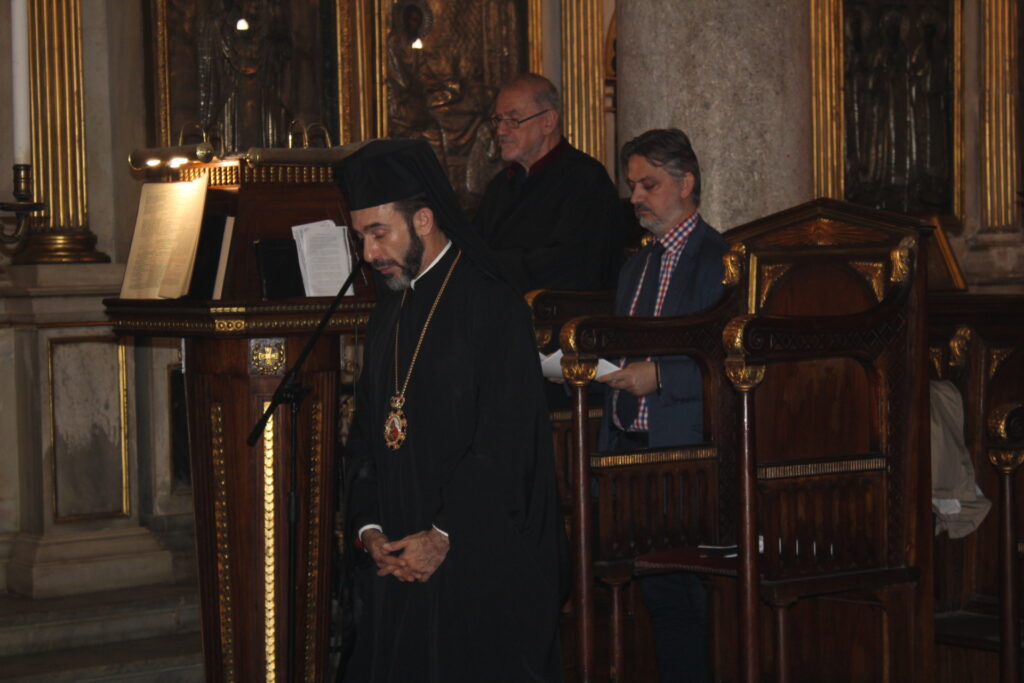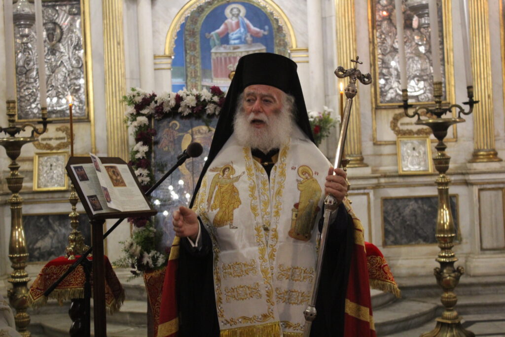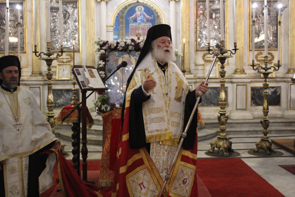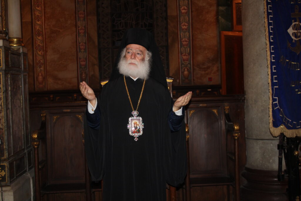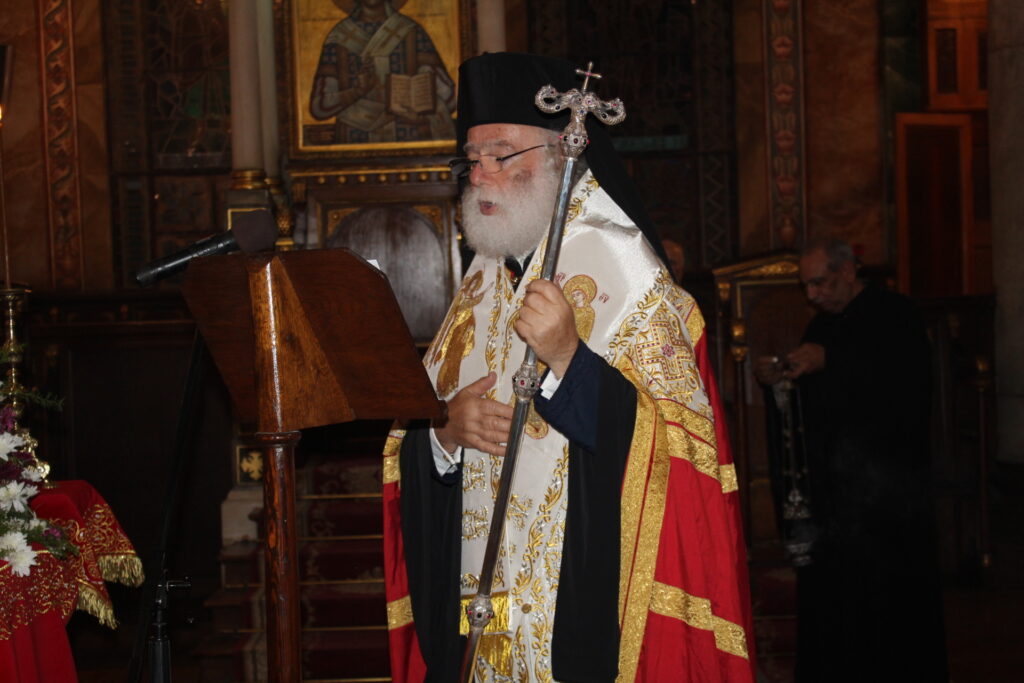 Στον Καθεδρικό Ιερό Ναό του Ευαγγελισμού η μορφή του Πάπα και Πατριάρχη Αλεξανδρείας και πάσης Αφρικής Θεοδώρου Β΄ δέσποζε ανάμεσα στους πιστούς που με κατανυκτικότητα παρακολουθούσαν τον Ιεράρχη τους να προσεύχεται όρθιος και να τους ευλογεί.