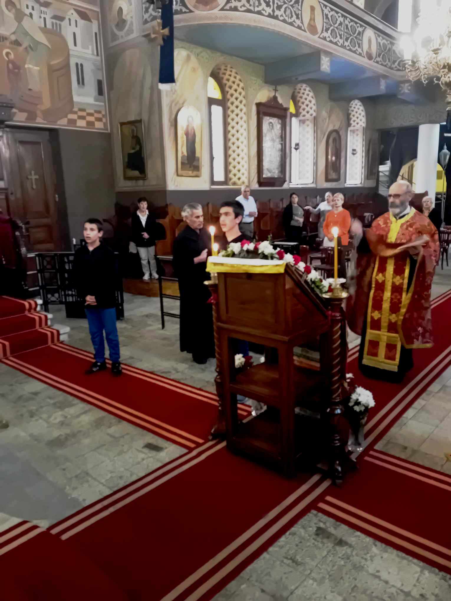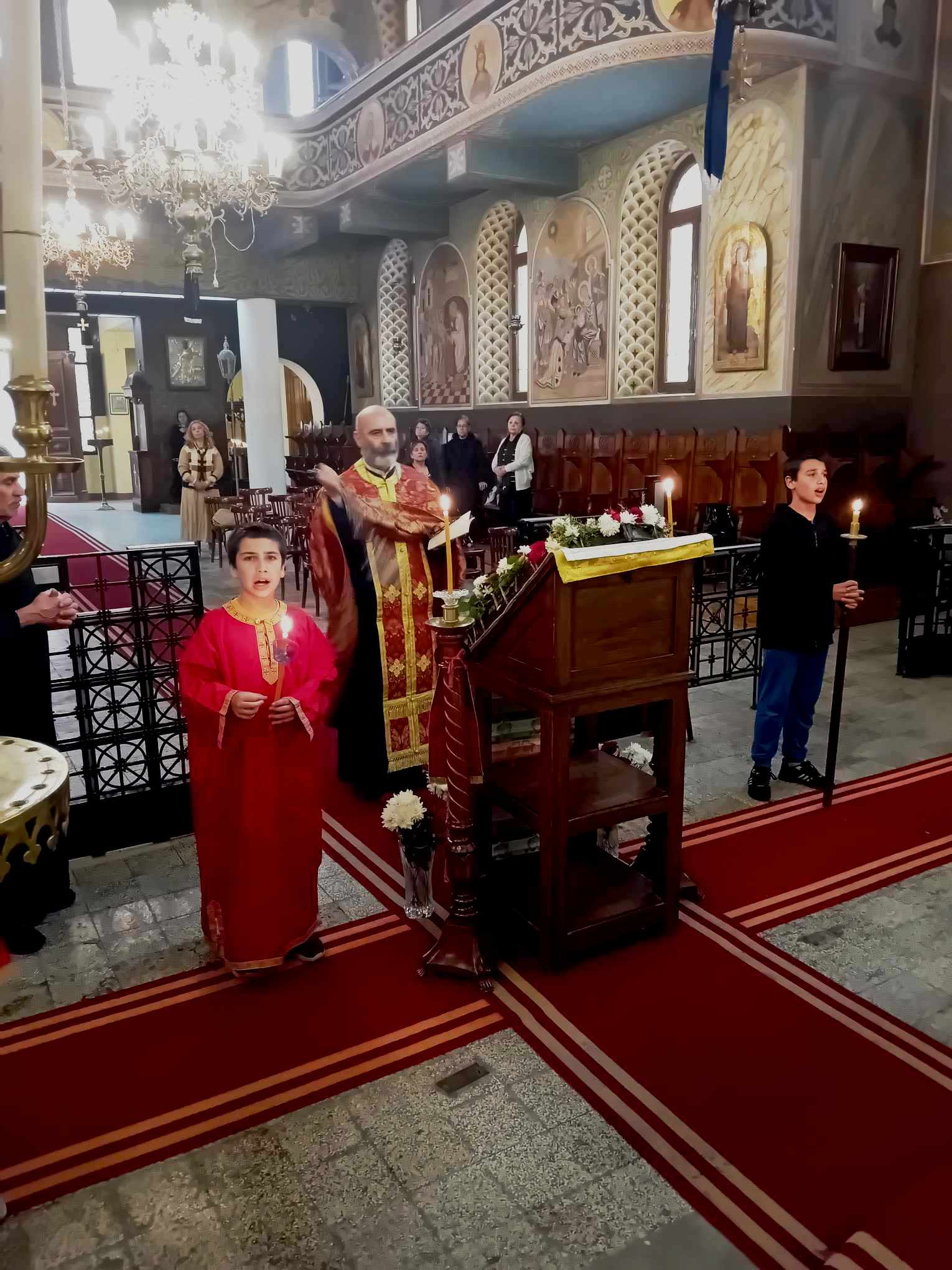 Οι δύο καλλικέλαδοι ιεροψάλτες, ο Γενικός Πρόξενος κ. Ιωάννης Πυργάκης που προσφέρει τα μάλα με τη διττή ιδιότητα διπλωμάτη και ιεροψάλτη και ο έτερος εκφραστής της βυζαντινής μελωδίας και συνάμα εκπαιδευτικός κ. Αλέξανδρος Μπάσης, απέδωσαν με φωνητική δεινότητα και ιερότητα το τελετουργικό του Ακάθιστου ύμνου!