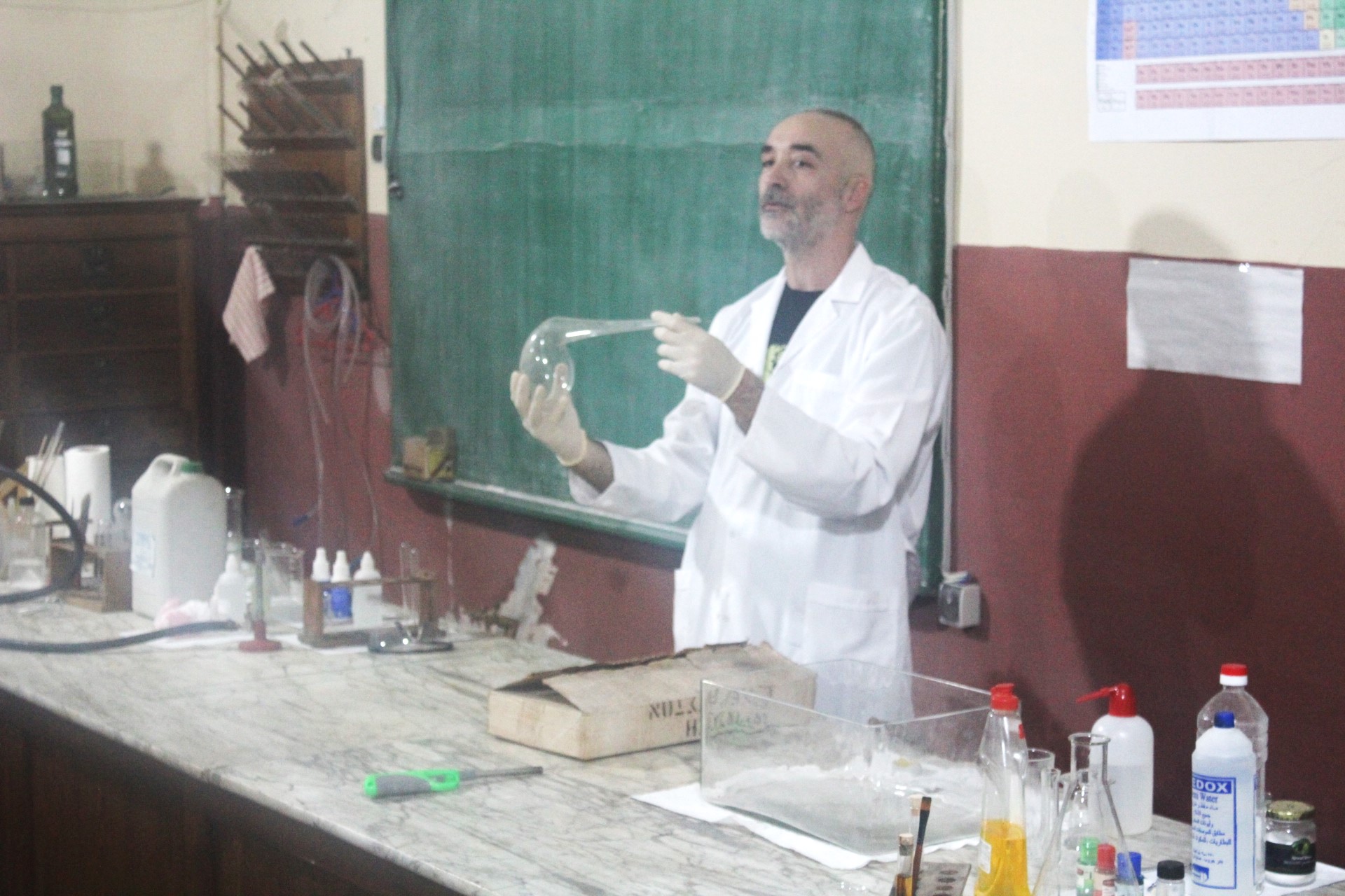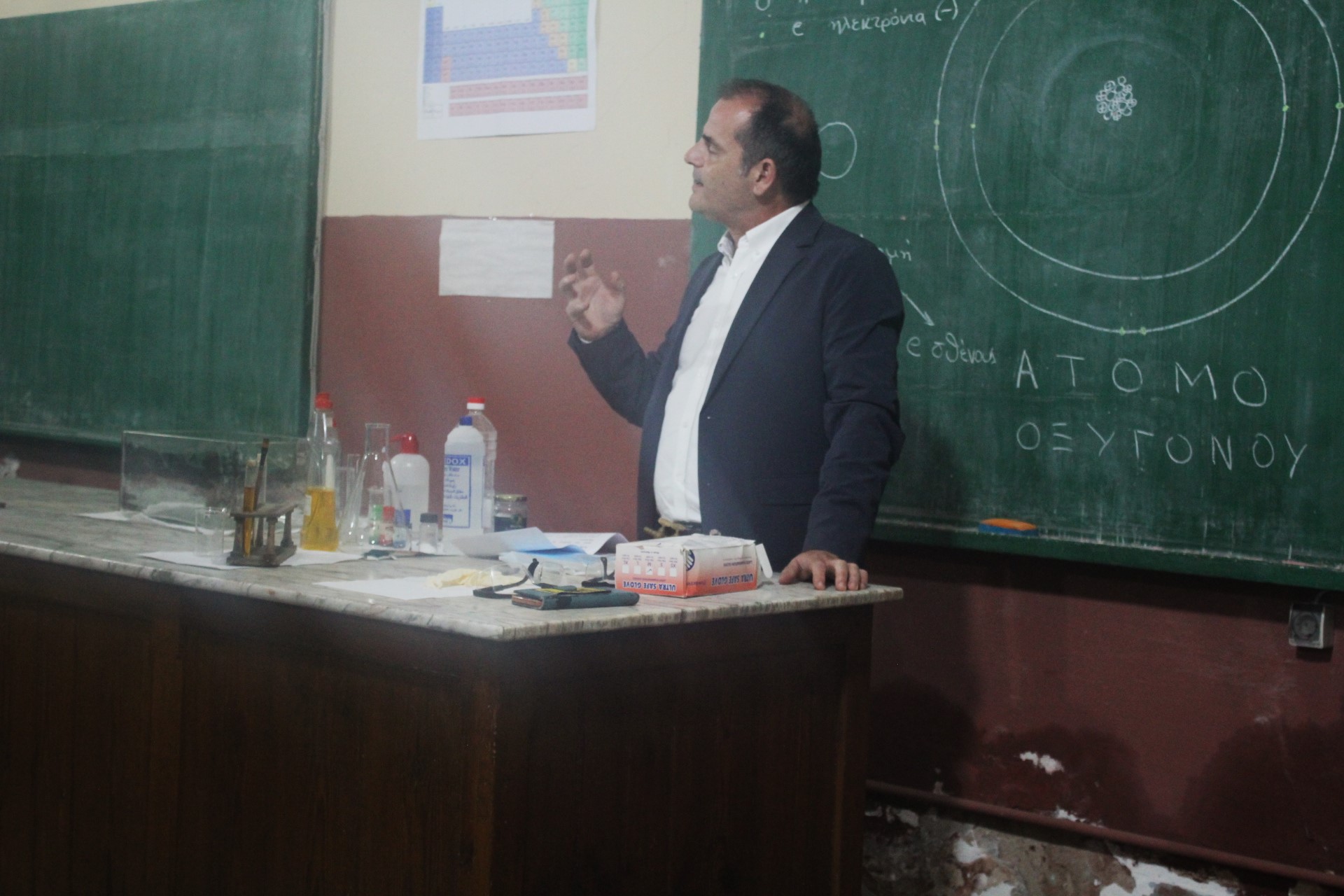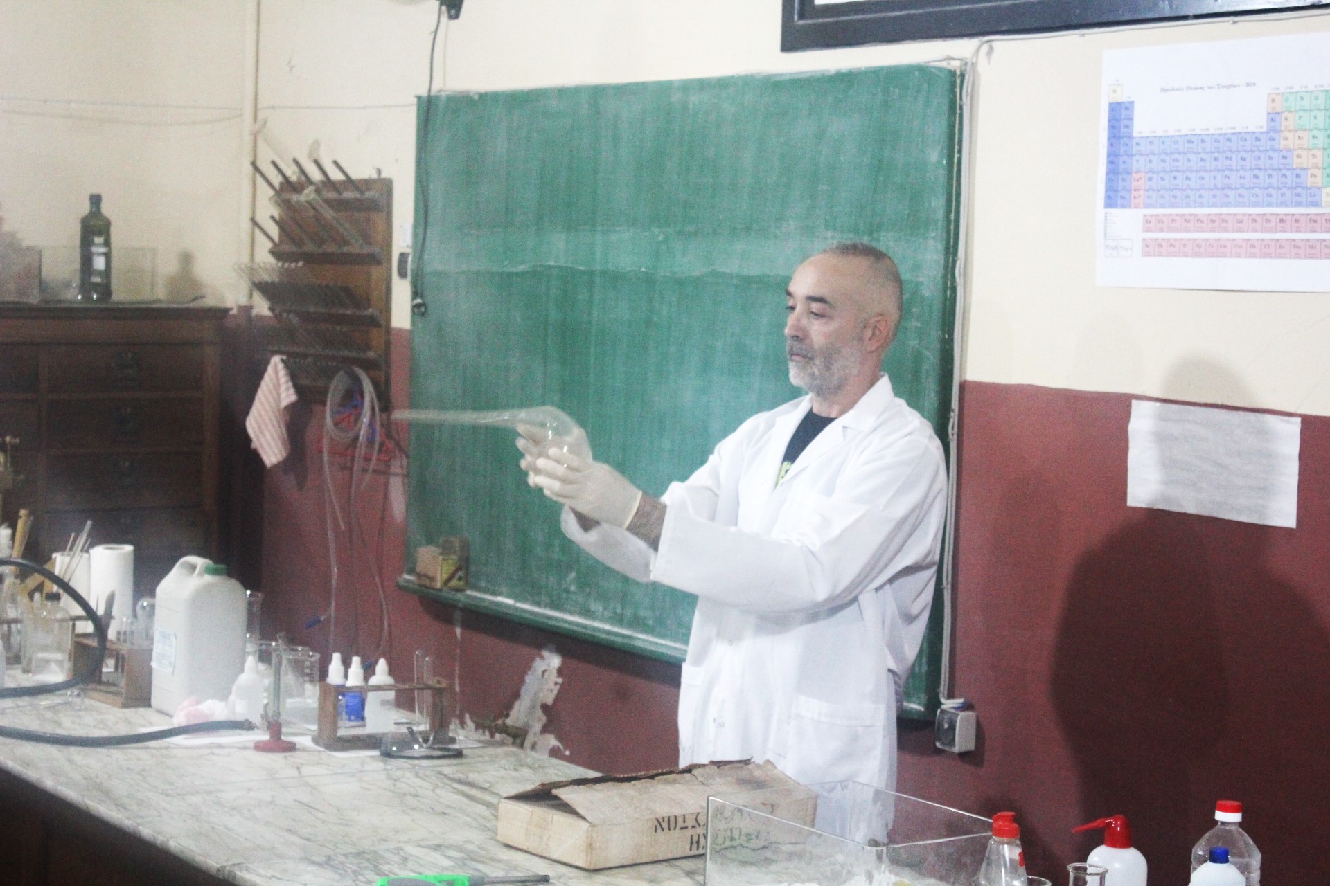 Ο Νικόλας Χαραλαμπάκης με πολύ μόχθο και μεράκι εργάστηκε αρκετές ημέρες εντός του αμφιθεάτρου ανακαλύπτοντας μέσα στα συρτάρια τα πολύτιμα χημικά όργανα καθώς και την ταυτότητα του αείμνηστου επιμελητή.