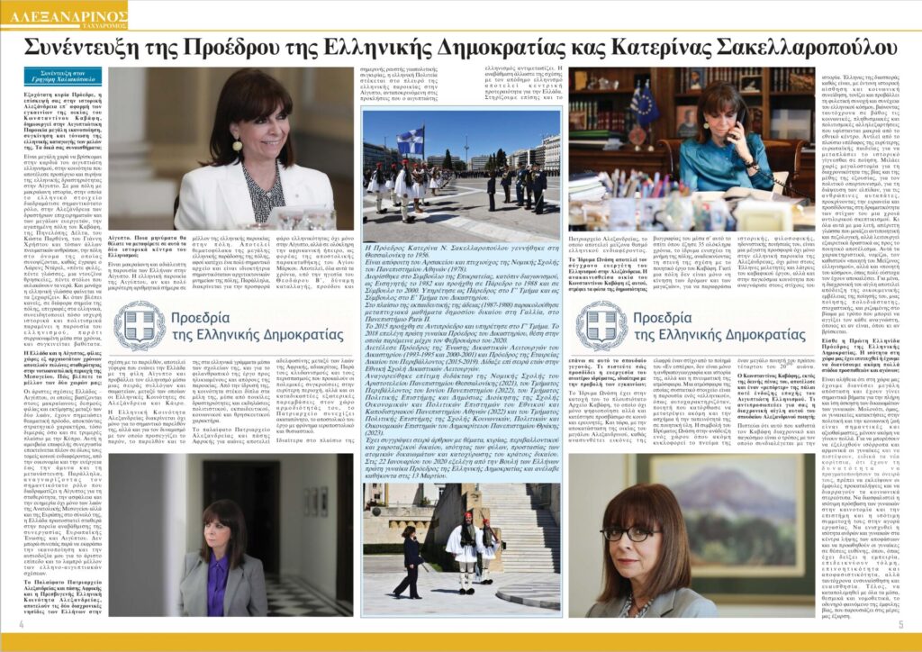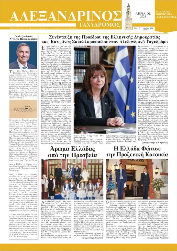 Κυκλοφόρησε ο “Αλεξανδρινός Ταχυδρόμος” Απριλίου 2024, στο σαλόνι του οποίου φιλοξενείται συνέντευξη της Προέδρου της Ελληνικής Δημοκρατίας Κας Κατερίνας Σακελλαροπούλου στο Γρηγόρη Χαλιακόπουλο, επ΄ αφορμή της επισκέψεώς της στην Αλεξάνδρεια για την τελετή των εγκαινίων της ανακαινισμένης, εκ του Ιδρύματος Ωνάση, οικίας του Κωνσταντίνου Καβάφη.