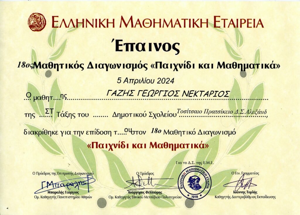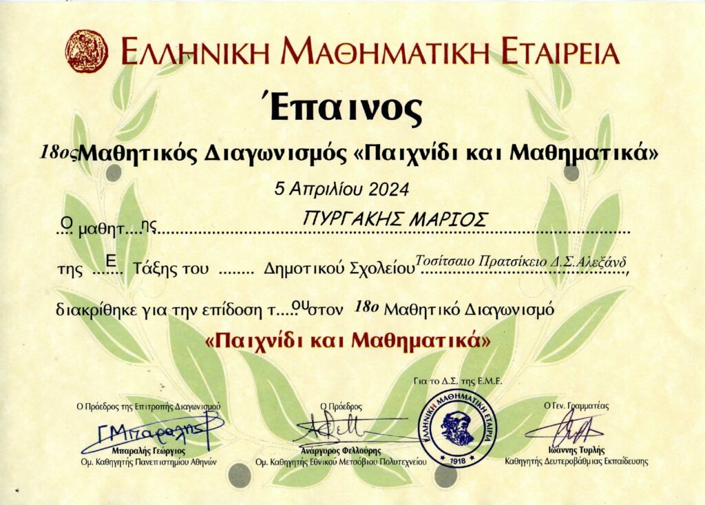 Την Παρασκευή 5 Απριλίου 2024 οι μαθητές των Ε΄ και Στ’ τάξεων του σχολείου μας με την ενθάρρυνση και τις οδηγίες του δασκάλου τους κ. Πάνου Γαζή πήραν για δεύτερη φορά μέρος στον 18ο Πανελλήνιο Μαθητικό Διαγωνισμό με τίτλο «Παιχνίδι και Μαθηματικά» που διοργάνωσε η Ελληνική Μαθηματική Εταιρεία και το περιοδικό «Ο Μικρός Ευκλείδης». Τα παιδιά μέσω του διαγωνισμού ήρθαν σε επαφή με δραστηριότητες και μαθηματικά προβλήματα με παιγνιώδη χαρακτήρα καλλιεργώντας τη μαθηματική τους σκέψη. Σχεδόν όλοι οι μαθητές έγραψαν πάνω από 50% και αυτό ήταν κάτι που μας έδωσε μεγάλη χαρά. Σύμφωνα με τους κανόνες του Διαγωνισμού Έπαινο Διάκρισης παίρνει ο μαθητής με το καλύτερο γραπτό από κάθε τάξη. Από την Ε τάξη Έπαινο Διάκρισης παίρνουν ο Μάριος Πυργκάκης και ο Χρήστος Άστωρ λόγω ισοβαθμίας και από τη Στ τάξη ο Γεώργιος Νεκτάριος Γαζής. Τα γραπτά των μαθητών διορθώθηκαν αρχικά από τον δάσκαλο της τάξης κ. Πάνο Γαζή και στη συνέχεια στάλθηκαν στα Γραφεία της Ελληνικής Μαθηματικής Εταιρείας στην Αθήνα για έλεγχο και επικύρωση. Οι Ελληνική Μαθηματική Εταιρεία έστειλε και τα βραβεία των μαθητών πριν λίγες μέρες για να τα παραλάβουν οι μαθητές στην τελική εορτή του Τοσίτσαιου – Πρατσίκειου που θα γίνει την Παρασκευή 14 Ιουνίου 2024.