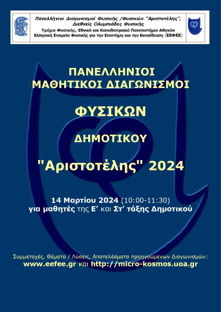 Στις 14 Μαρτίου 2024 πραγματοποιήθηκε ο Πανελλήνιος Μαθητικός Διαγωνισμός Φυσικών «Αριστοτέλης», που συνδιοργανώνουν σε ετήσια βάση το Τμήμα Φυσικής του Εθνικού και Καποδιστριακού Πανεπιστημίου Αθηνών και η Ελληνική Εταιρεία Φυσικής για την Επιστήμη και την Εκπαίδευση (ΕΕΦΕΕ). Με την παρότρυνση και εμψύχωση της δασκάλας που διδάσκει Φυσική στις Ε και Στ τάξεις κ. Ελένης Παναρέτου Γαζή, στον διαγωνισμό αυτό συμμετείχαν για δεύτερη φορά μαθητές του σχολείου μας. Δύο μαθητές μας από την Ε’ Δημοτικού, ο Χρήστος Άστωρ και ο Μάριος Πυργάκης και 2 μαθητές από την Στ τάξη, ο Γεώργιος Νεκτάριος Γαζής και ο Χάσαν Σάμπρυ, κατόρθωσαν να διακριθούν σε πανελλαδικό επίπεδο μεταξύ χιλιάδων άλλων μαθητών! Και οι τέσσερις τους έλαβαν Εύφημο Μνεία σύμφωνα με τους κανονισμούς του διαγωνισμού.
