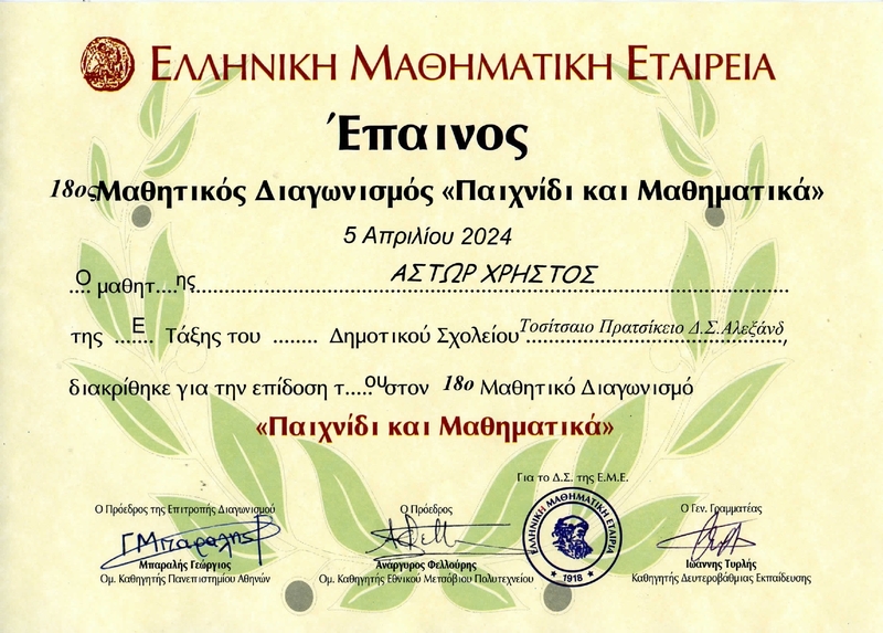 Την Παρασκευή 5 Απριλίου 2024 οι μαθητές των Ε΄ και Στ’ τάξεων του σχολείου μας με την ενθάρρυνση και τις οδηγίες του δασκάλου τους κ. Πάνου Γαζή πήραν για δεύτερη φορά μέρος στον 18ο Πανελλήνιο Μαθητικό Διαγωνισμό με τίτλο «Παιχνίδι και Μαθηματικά» που διοργάνωσε η Ελληνική Μαθηματική Εταιρεία και το περιοδικό «Ο Μικρός Ευκλείδης». Τα παιδιά μέσω του διαγωνισμού ήρθαν σε επαφή με δραστηριότητες και μαθηματικά προβλήματα με παιγνιώδη χαρακτήρα καλλιεργώντας τη μαθηματική τους σκέψη. Σχεδόν όλοι οι μαθητές έγραψαν πάνω από 50% και αυτό ήταν κάτι που μας έδωσε μεγάλη χαρά. Σύμφωνα με τους κανόνες του Διαγωνισμού Έπαινο Διάκρισης παίρνει ο μαθητής με το καλύτερο γραπτό από κάθε τάξη. Από την Ε τάξη Έπαινο Διάκρισης παίρνουν ο Μάριος Πυργκάκης και ο Χρήστος Άστωρ λόγω ισοβαθμίας και από τη Στ τάξη ο Γεώργιος Νεκτάριος Γαζής. Τα γραπτά των μαθητών διορθώθηκαν αρχικά από τον δάσκαλο της τάξης κ. Πάνο Γαζή και στη συνέχεια στάλθηκαν στα Γραφεία της Ελληνικής Μαθηματικής Εταιρείας στην Αθήνα για έλεγχο και επικύρωση. Οι Ελληνική Μαθηματική Εταιρεία έστειλε και τα βραβεία των μαθητών πριν λίγες μέρες για να τα παραλάβουν οι μαθητές στην τελική εορτή του Τοσίτσαιου – Πρατσίκειου που θα γίνει την Παρασκευή 14 Ιουνίου 2024.