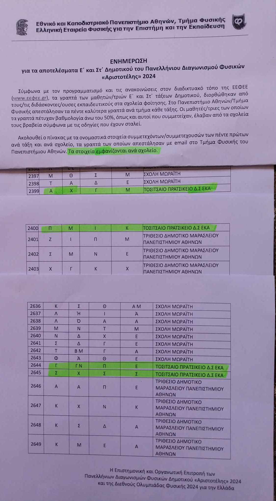 Στις 14 Μαρτίου 2024 πραγματοποιήθηκε ο Πανελλήνιος Μαθητικός Διαγωνισμός Φυσικών «Αριστοτέλης», που συνδιοργανώνουν σε ετήσια βάση το Τμήμα Φυσικής του Εθνικού και Καποδιστριακού Πανεπιστημίου Αθηνών και η Ελληνική Εταιρεία Φυσικής για την Επιστήμη και την Εκπαίδευση (ΕΕΦΕΕ). Με την παρότρυνση και εμψύχωση της δασκάλας που διδάσκει Φυσική στις Ε και Στ τάξεις κ. Ελένης Παναρέτου Γαζή, στον διαγωνισμό αυτό συμμετείχαν για δεύτερη φορά μαθητές του σχολείου μας. Δύο μαθητές μας από την Ε’ Δημοτικού, ο Χρήστος Άστωρ και ο Μάριος Πυργάκης και 2 μαθητές από την Στ τάξη, ο Γεώργιος Νεκτάριος Γαζής και ο Χάσαν Σάμπρυ, κατόρθωσαν να διακριθούν σε πανελλαδικό επίπεδο μεταξύ χιλιάδων άλλων μαθητών! Και οι τέσσερις τους έλαβαν Εύφημο Μνεία σύμφωνα με τους κανονισμούς του διαγωνισμού.