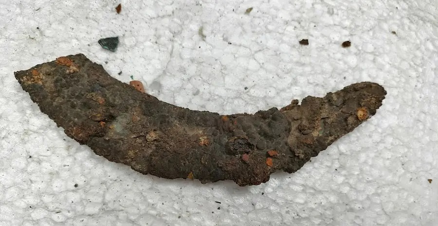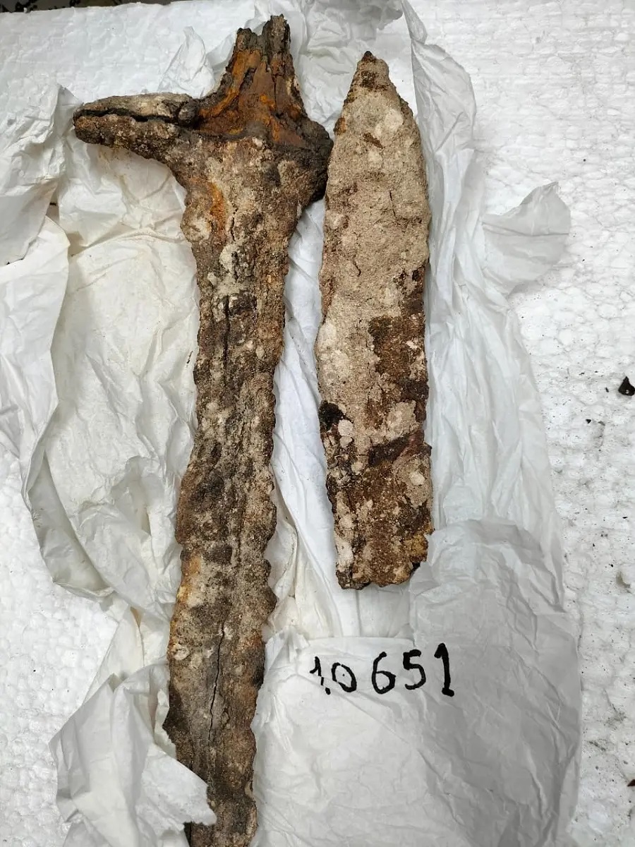 Ένα τυπικό ξίφος Έλληνα οπλίτη της αρχαιότητας βρέθηκε στη νεκρόπολη του Σάτμπυ. Σώζεται σε δύο κομμάτια, το μήκος του δεν ξεπερνά τα 60 cm και, όπως ανέφερε ο κ. Μανιώτης, «είναι ένας τύπος οπλισμού που συναντάται σε μεγάλο γεωγραφικό εύρος του αρχαίου κόσμου».
