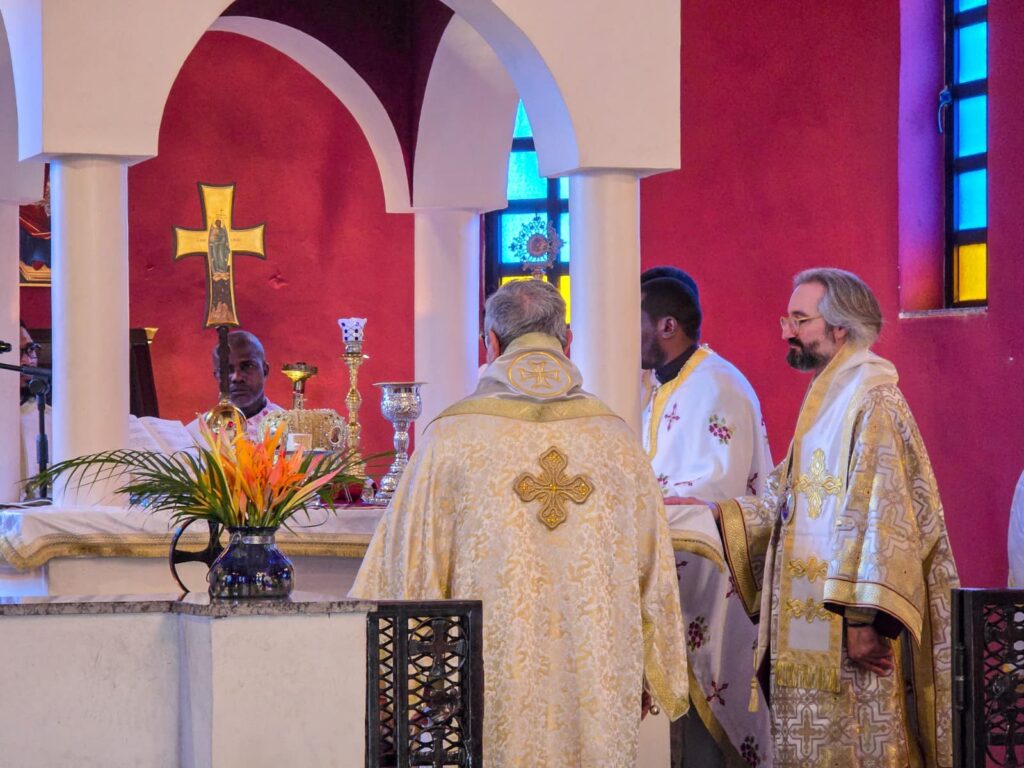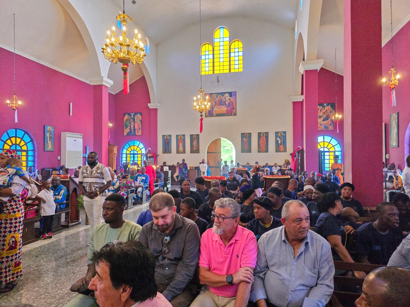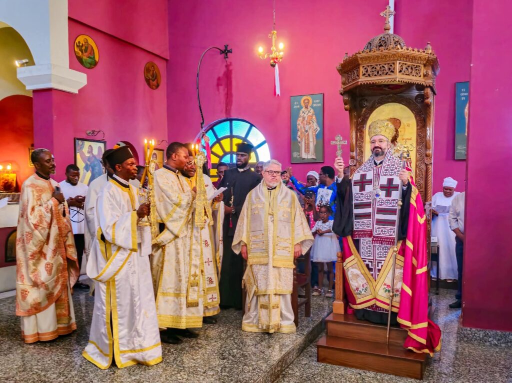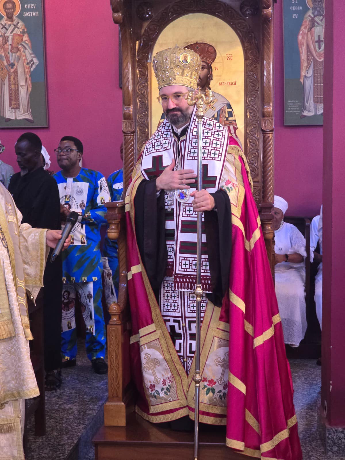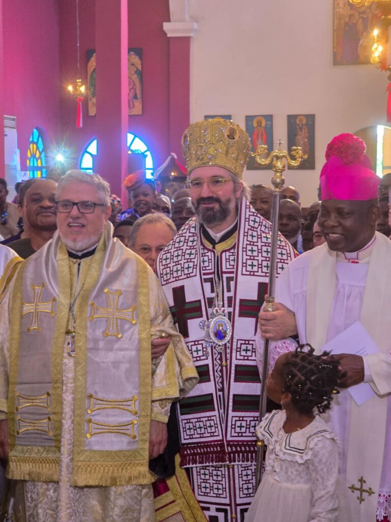 Του Αρχιερατικού Συλλείτουργου προέστη ο εκπρόσωπος του Μακαριωτάτου Πατριάρχου, Μητροπολίτης Γουινέας κ. Γεώργιος, συλλειτουργούντων του Σεβασμιωτάτου Μητροπολίτου Νιγηρίας κ. Νικοδήμου και όλων των κληρικών της Μητροπόλεως, συμπροσευχομένων πλήθους πιστών, οι οποίοι προσήλθαν για να δηλώσουν την χαρά τους αλλά και την αμέριστη αγάπη τους προς το νέο Ποιμενάρχη τους.