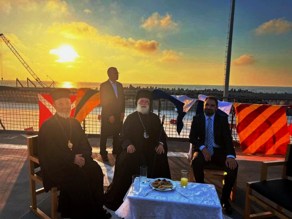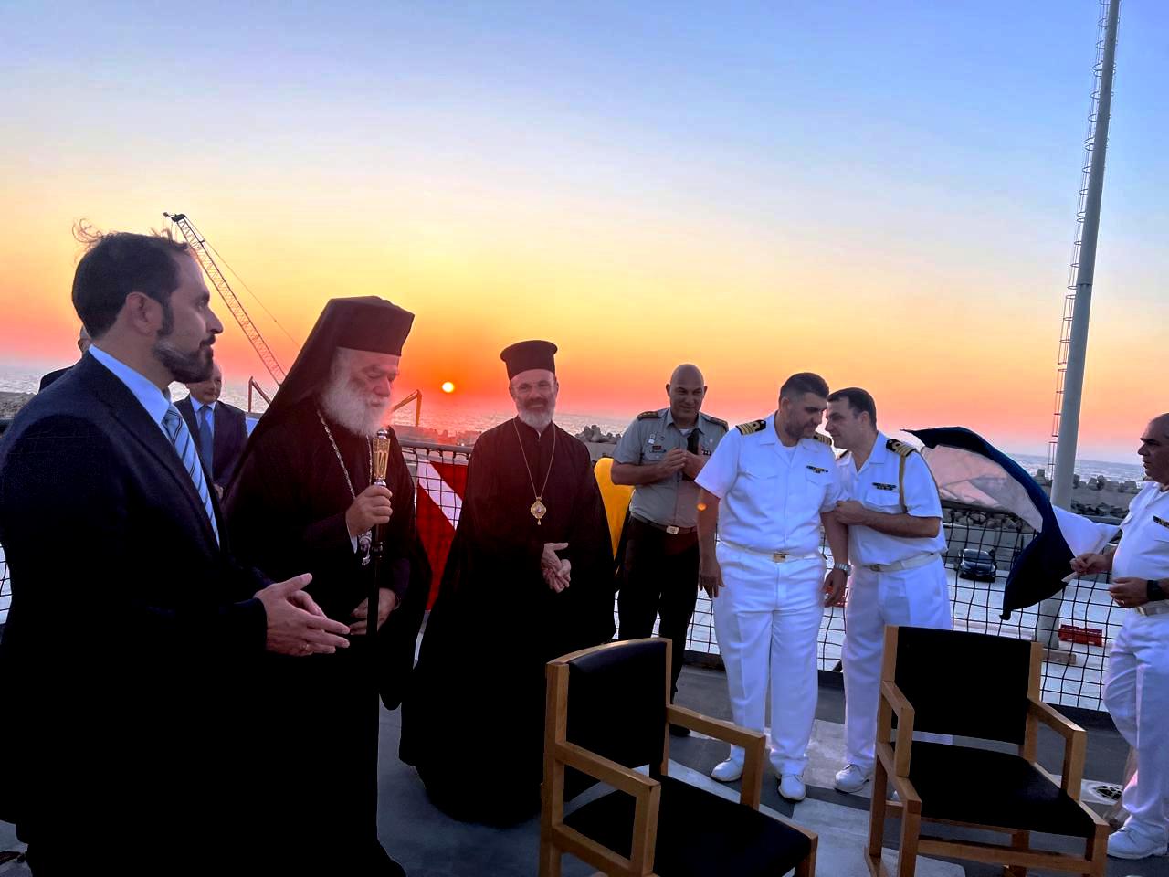 Ο καπετάνιος κ. Σιδεράς καλωσόρισε άπαντες για την παρουσία τους στο Αρματαγωγό «Χίος», ο Σύμβουλος της Πρεσβείας κ. Αθανάσιος Λεούσης ανεφέρθη στην φιλοξενία και την δύναμη της ελληνοαιγυπτιακής φιλίας που έχουν δημιουργήσει οι δύο φίλιες χώρες μας με όλα τα θετικά αποτελέσματα, ενώ ο Μακαριώτατος συγκίνησε όπως πάντα τους παρευρισκομένους τονίζοντας ότι είναι ευλογία να βρίσκεται επάνω στο πλοίο και συνάμα υπενθύμισε σε όλους με τον λόγο του, την αξία της συνεργασίας των κρατών μας για την ειρήνη, την ασφάλεια και την ομόνοια.