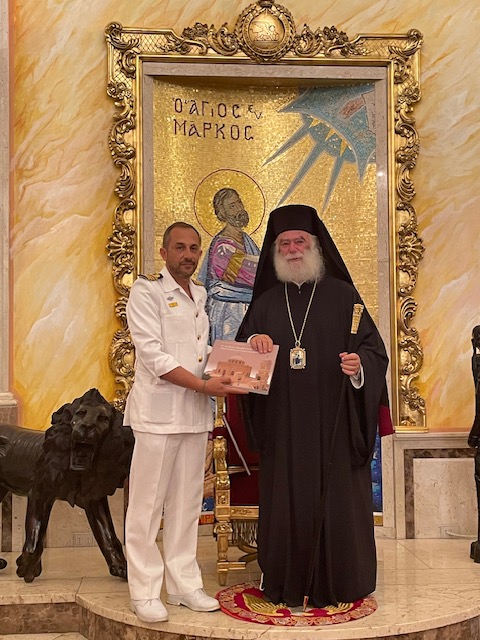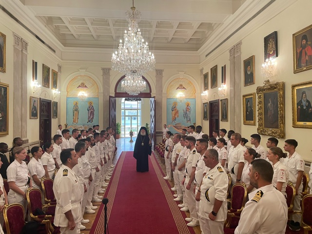 Επίσκεψη στην έδρα του Παλαιφάτου Πατριαρχείου Αλεξανδρείας πραγματοποίησαν την Πέμπτη, 25η Ιουλίου 2024, ο κυβερνήτης, οι αξιωματικοί οι δόκιμοι υπαξιωματικοί της Σχολής Μονίμων Υπαξιωματικών Π.Ν. (Σ.Μ.Υ.Ν.) και τα μέλη του πληρώματος του ελληνικού πολεμικού πλοίου Α/Γ «Χίος», το οποίο κατέπλευσε στο λιμάνι της Αλεξάνδρειας στα πλαίσια του θερινού εκπαιδευτικού πλου.