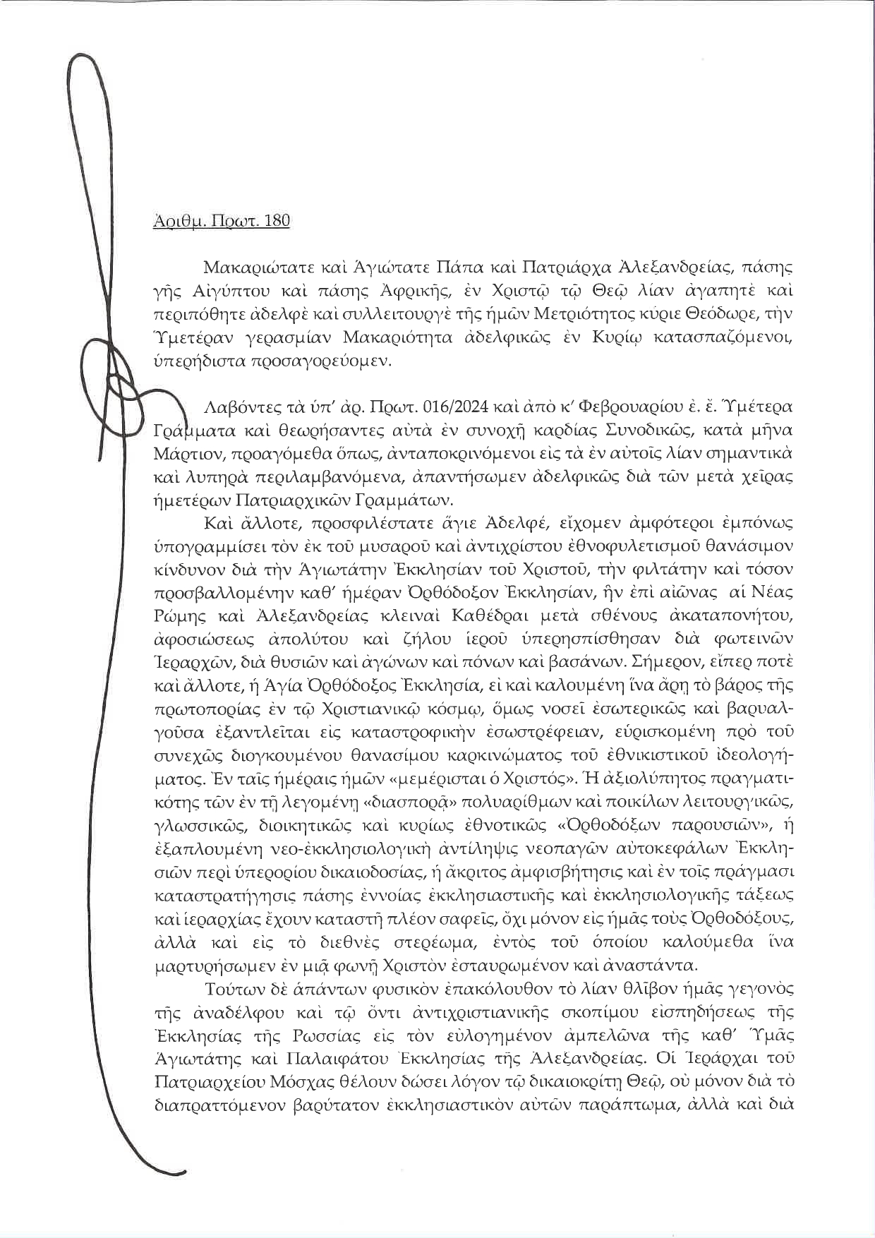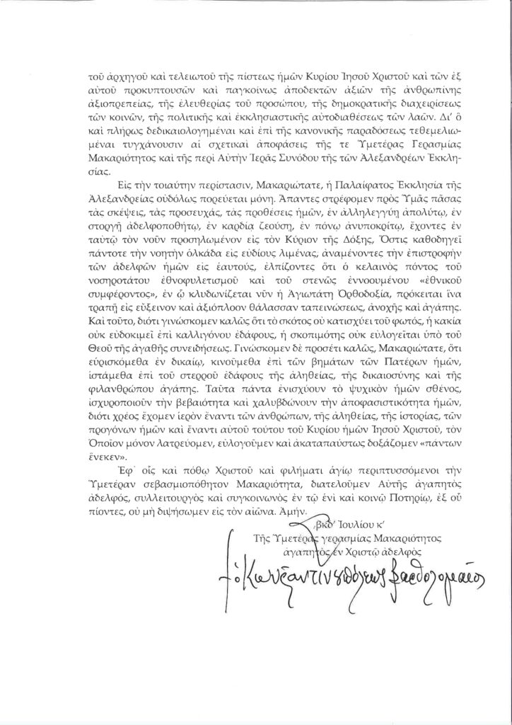 Βαρυσήμαντο Γράμμα του Οικουμενικού Πατριάρχη προς τον Αλεξανδρείας Θεόδωρο