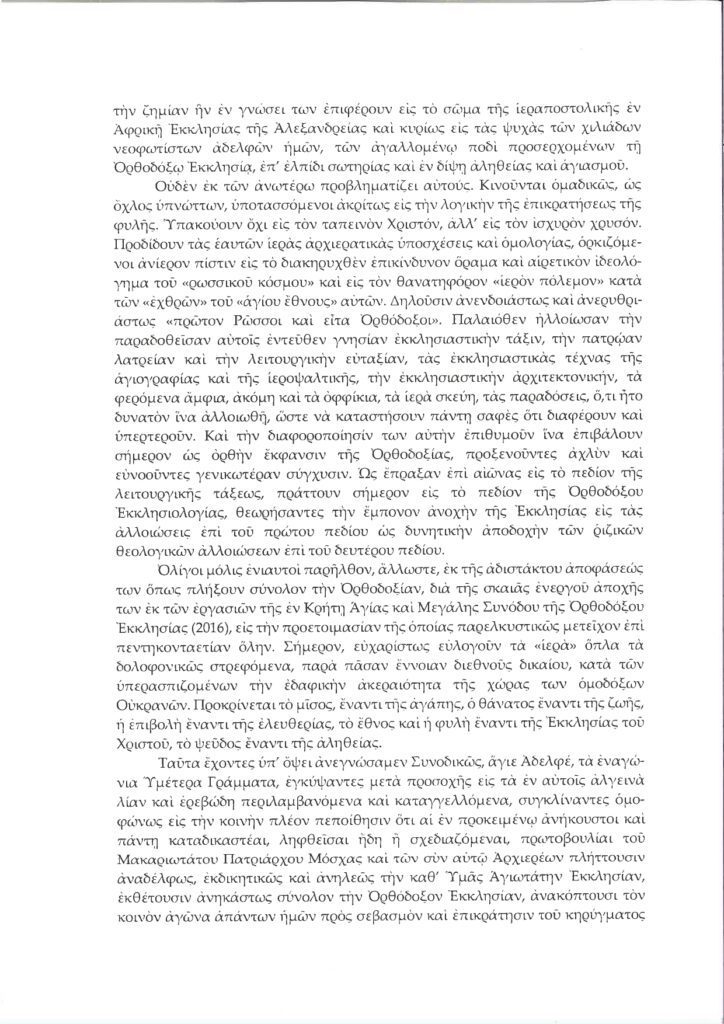 Ο Οικουμενικός Πατριάρχης δεν διστάζει να περιγράψει και την απαράδεκτη τακτική της Ρωσικής Εκκλησίας, η οποία πλήττει την πανορθόδοξη ενότητα. Ο Πατριάρχης διαβεβαιώνει τον Πατριάρχη Αλεξανδρείας ότι “ευρισκόμεθα εν δικαίω, κινούμεθα επί των βημάτων των Πατέρων ημών, ιστάμεθα επί του στερρού εδάφους της αληθείας, της δικαιοσύνης και της φιλναθρώπου αγάπης”.