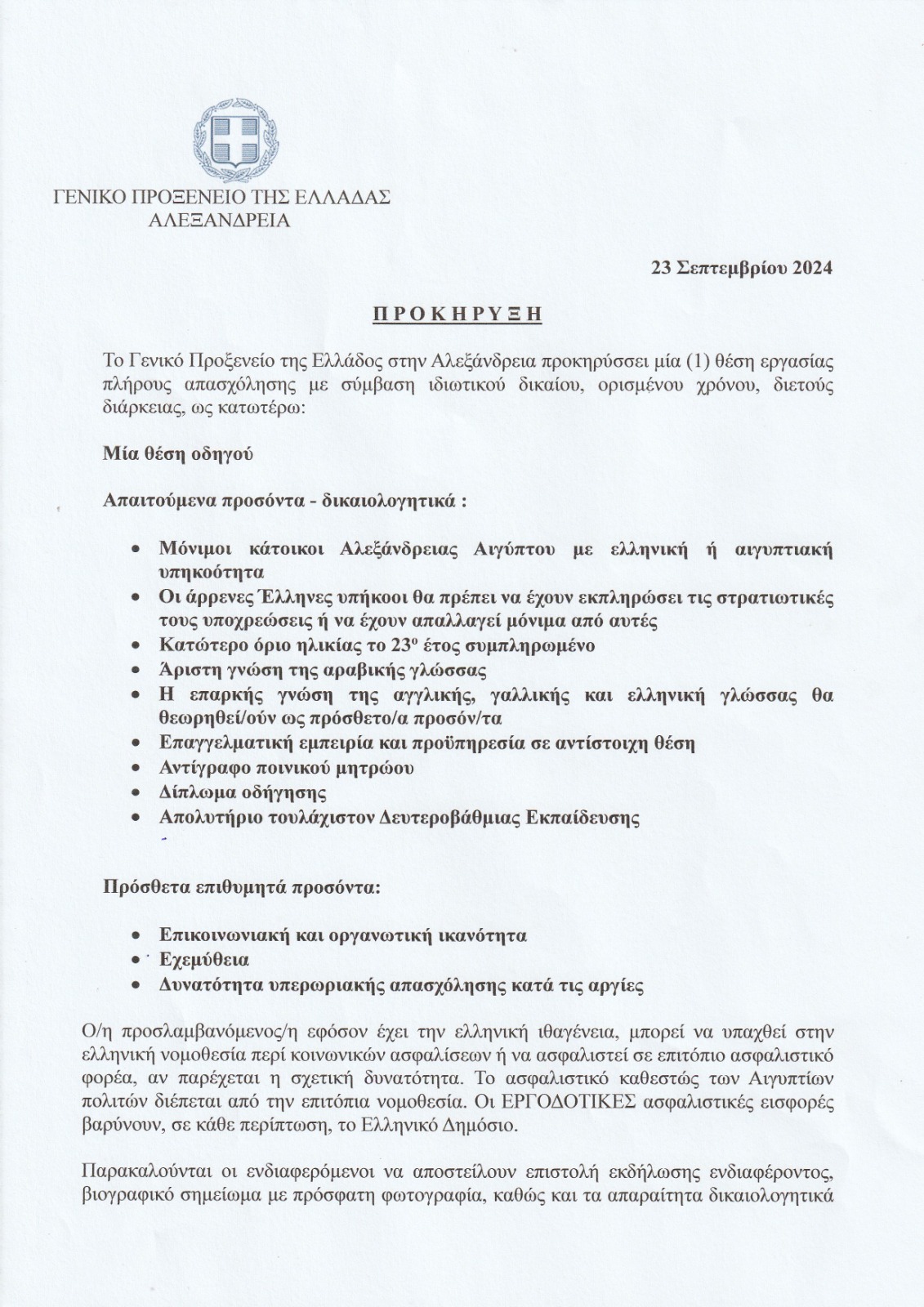 ΠΡΟΚΗΡΥΞΗ ΓΙΑ ΘΕΣΗ ΟΔΗΓΟΥ ΠΡΟΞΕΝΕΙΟΥ