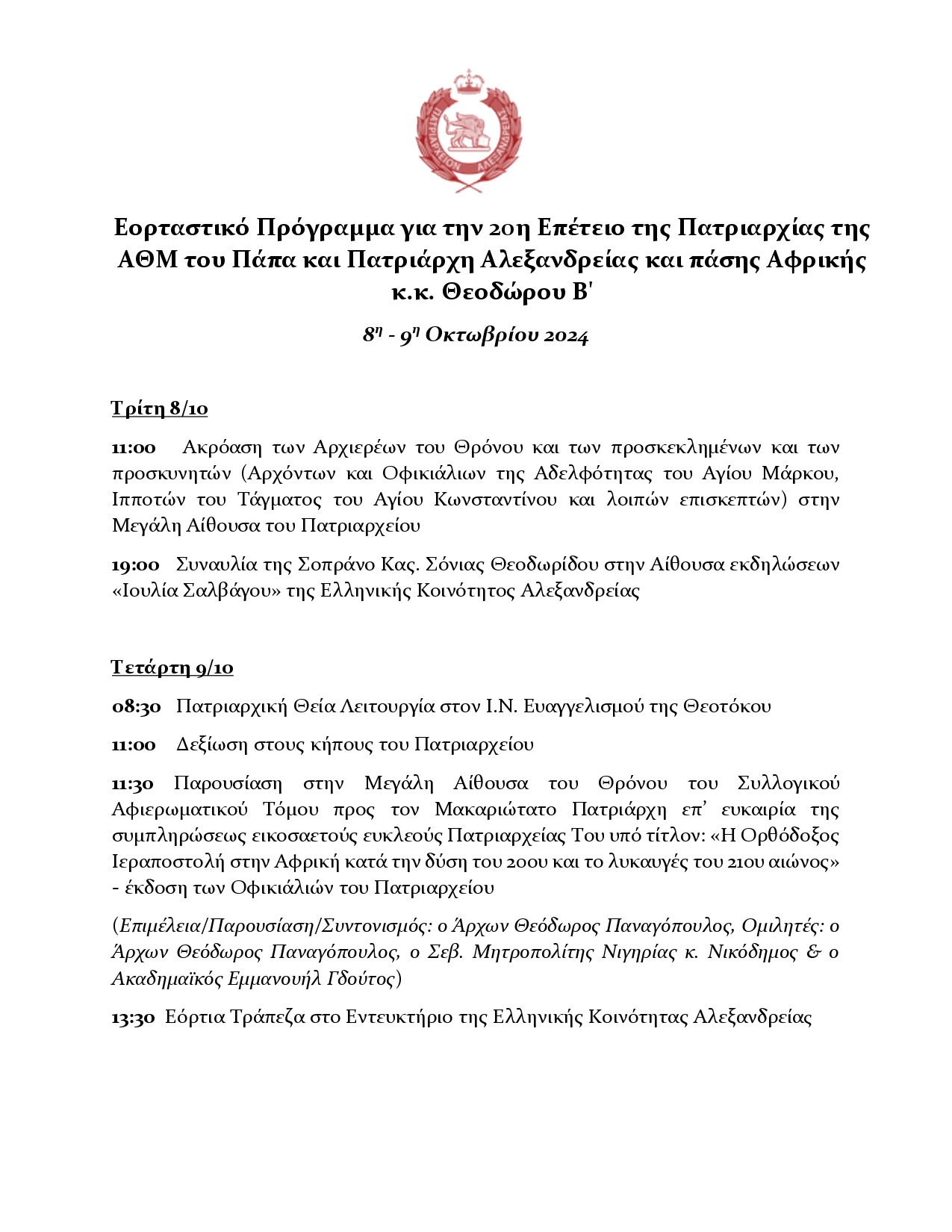 Εκδηλώσεις 20ης Επετείου Πατραρχίας της ΑΘΜ