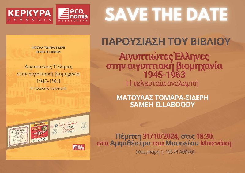 Την Πέμπτη 31 Οκτωβρίου 2024 και ώρα 18:30 στο Αμφιθέατρο του Μουσείου Μπενάκη πρόκειται να παρουσιαστεί το βιβλίο της «Αιγυπτιώτες Έλληνες στην αιγυπτιακή βιομηχανία 1945 -1963 η τελευταία αναλαμπή»
