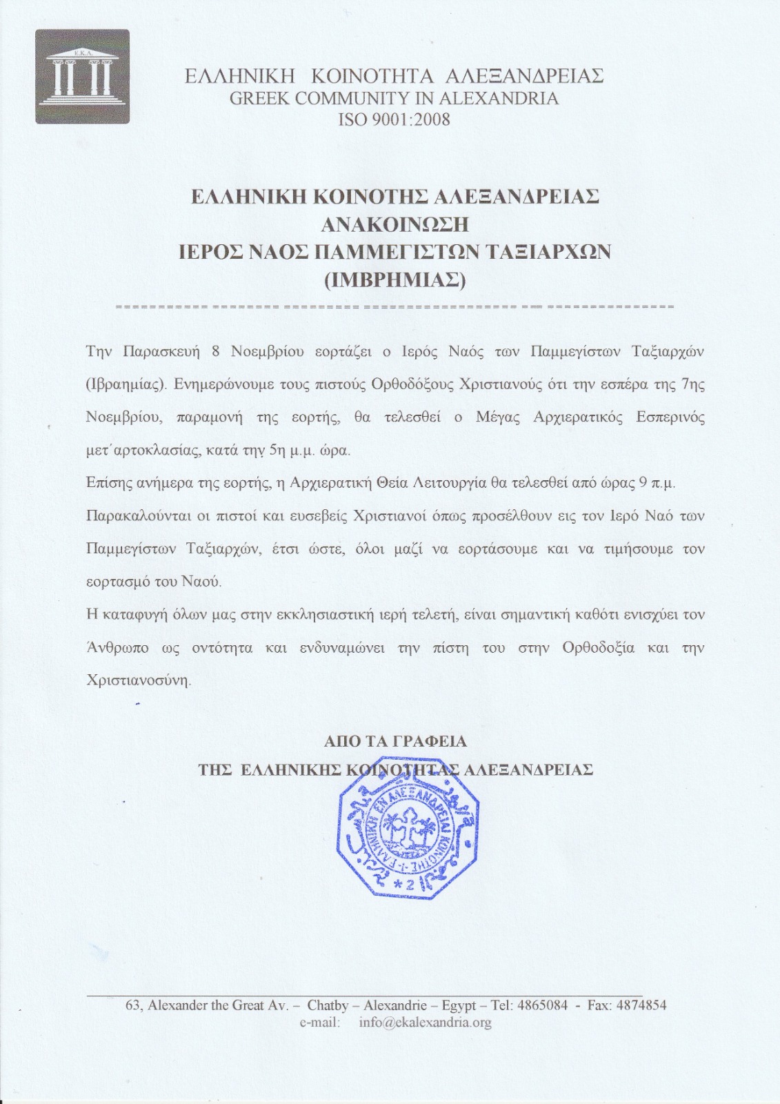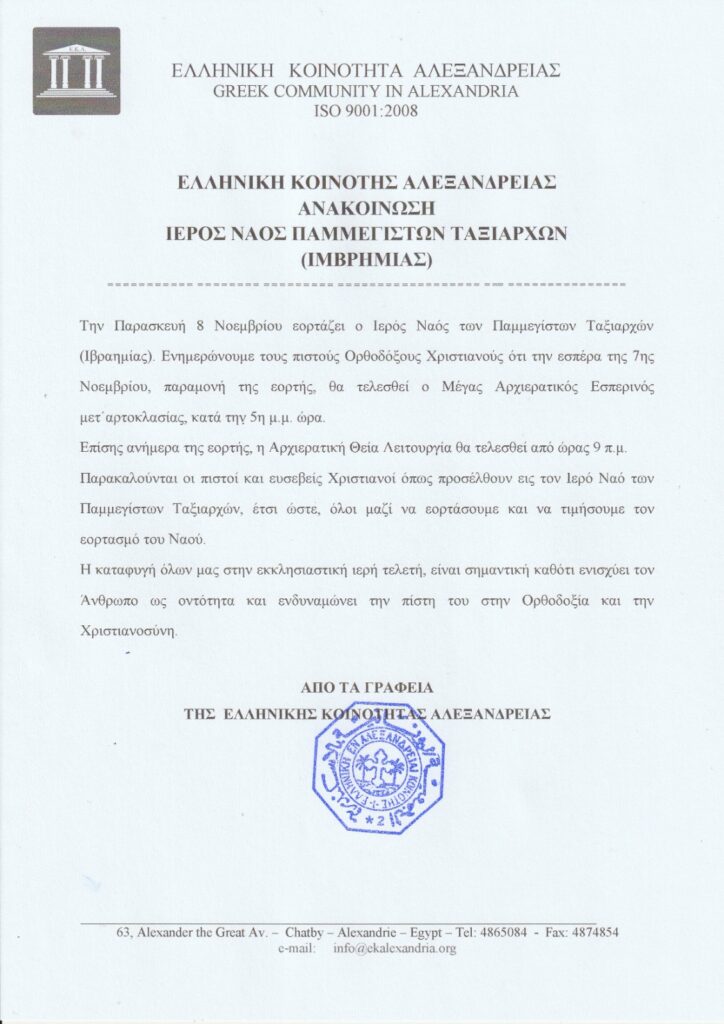 Ανακοίνωση περί της Εορτής των Ταξιαρχών