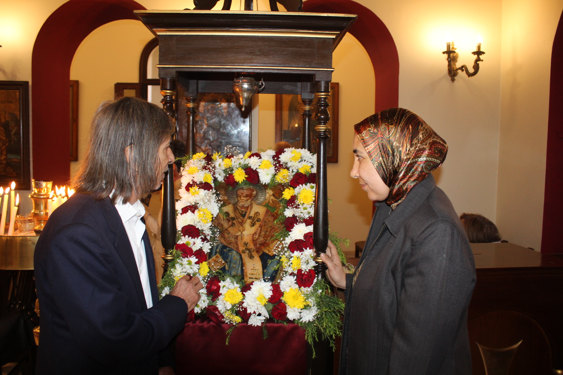 Παρούσα και η υπεύθυνη των Ξενώνων της Ελληνικής Κοινότητας κα Ελένη Άστωρ, προσευχόταν με σεβασμό έμπροσθεν της ιστορικής εικόνας της Ορθόδοξης Χριστιανοσύνης.