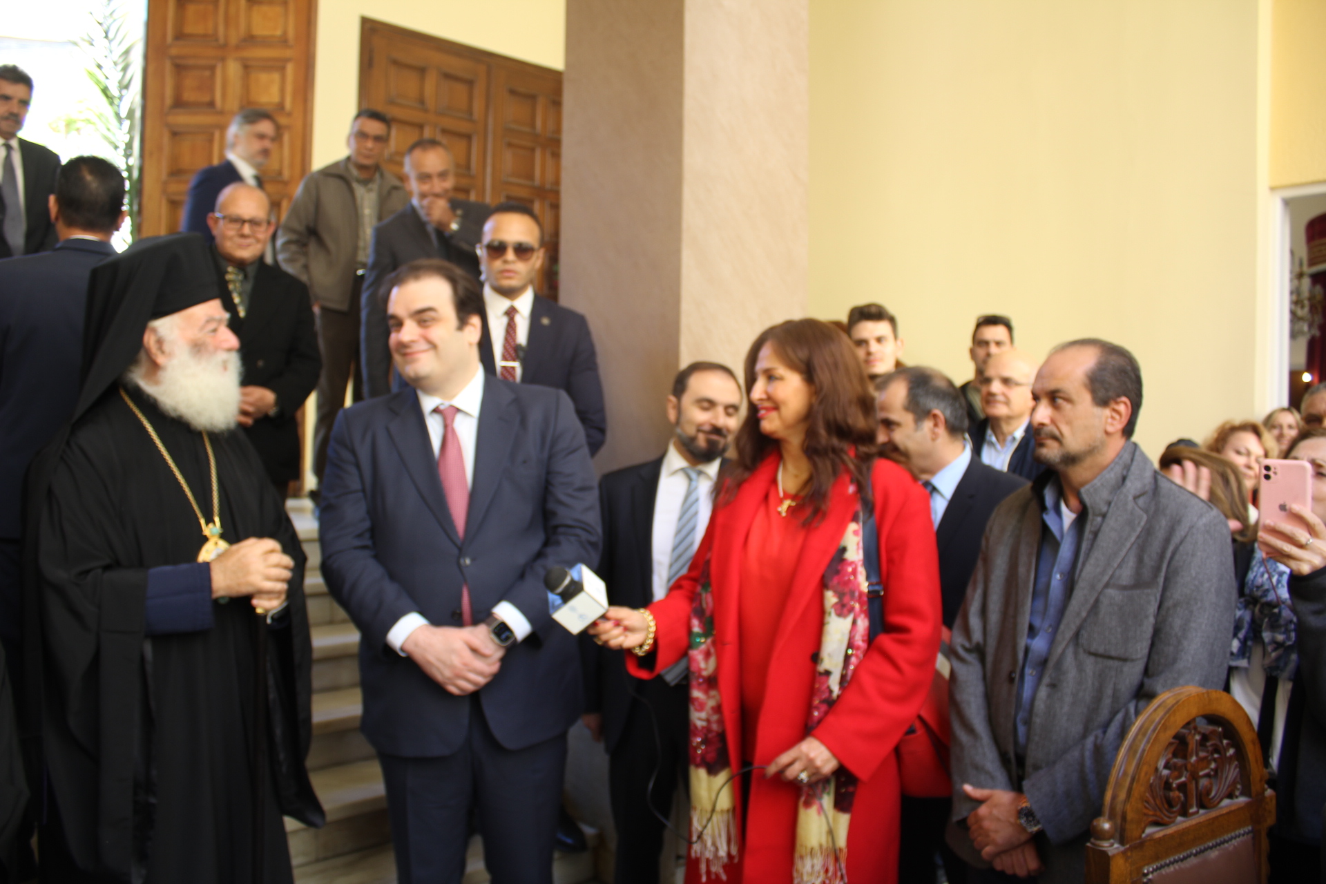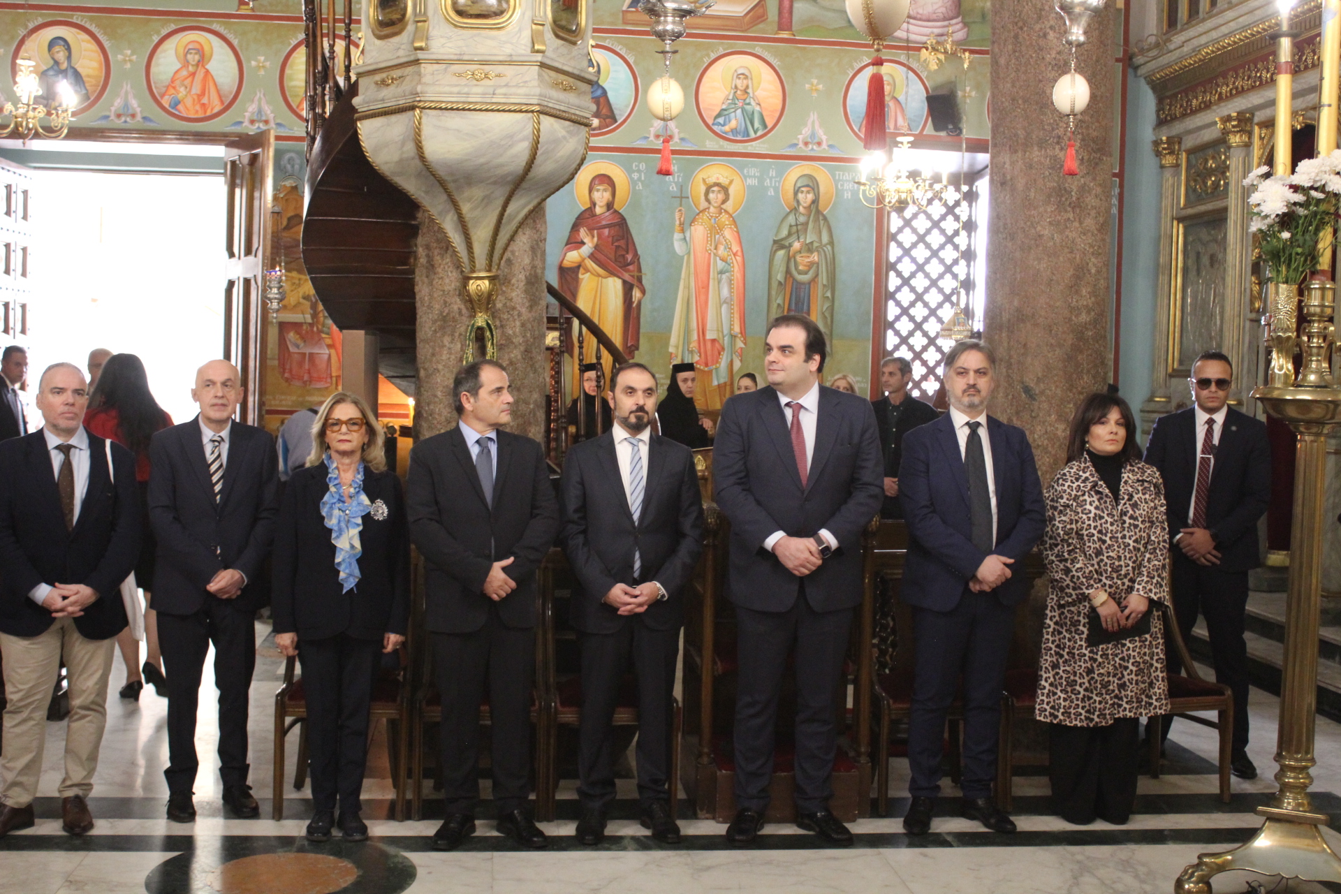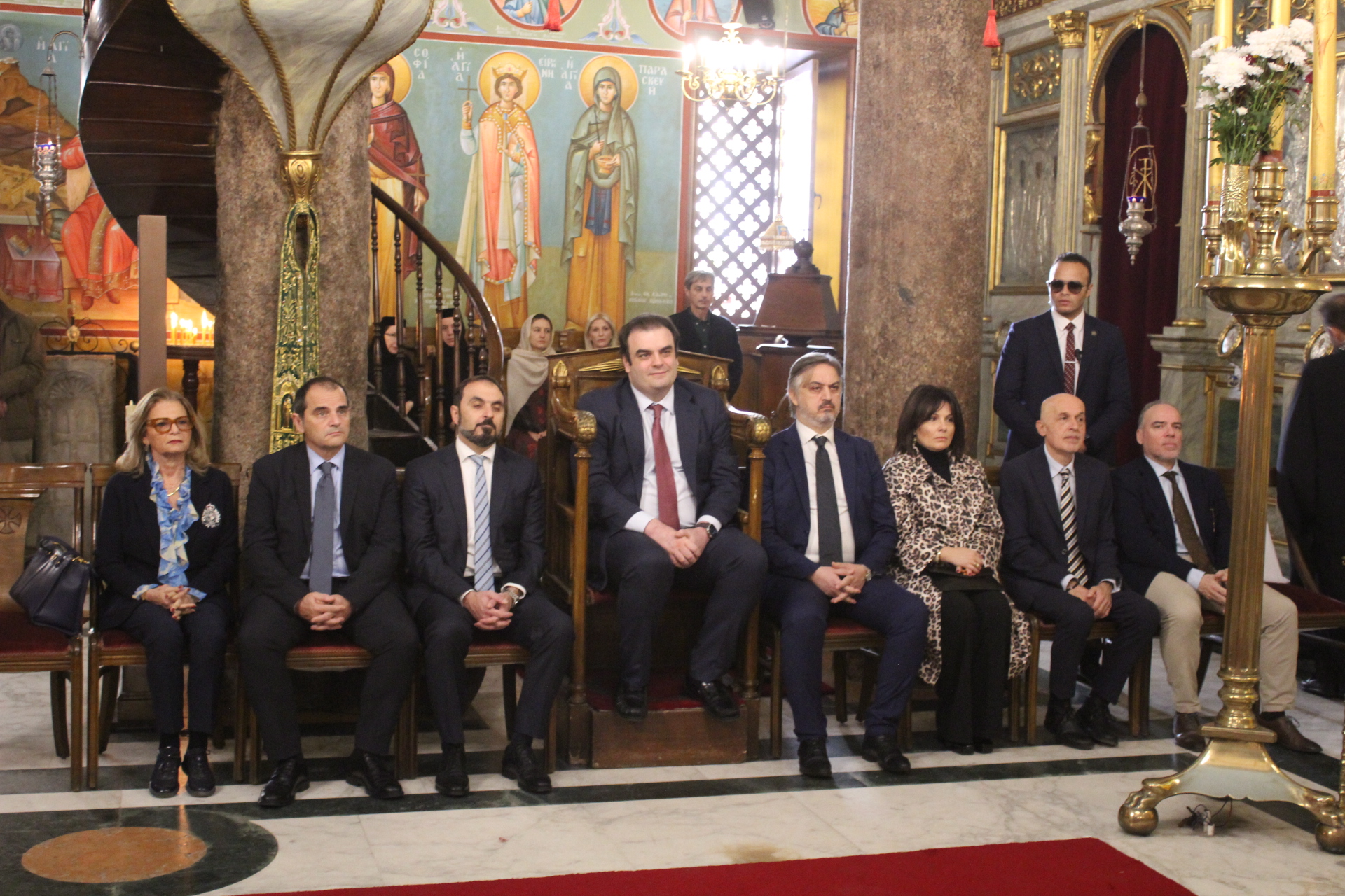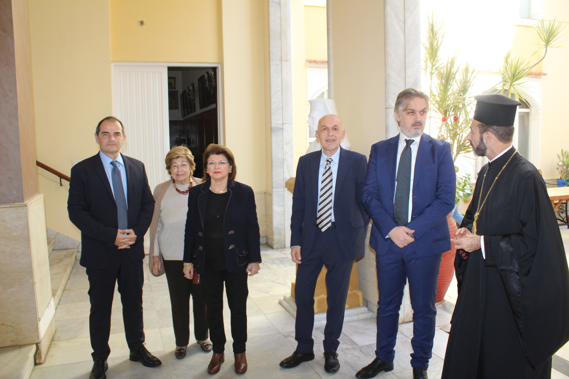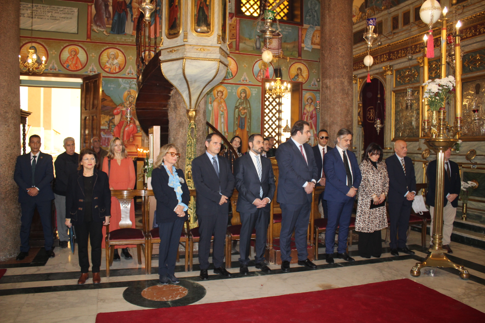 Μαζί του παρευρίσκοντο οι κάτωθι εκπρόσωποι των θεσμών του Αιγυπτιωτισμού: ο Επιτετραμμένος της Ελληνικής Πρεσβείας στο Κάϊρο κ. Λεούσης, ο Γενικός Πρόξενος της Ελλάδας στην Αλεξάνδρεια κ. Ιωάννης Πυργάκης, ο Πρόεδρος της Ελληνικής Κοινότητας Αλεξανδρείας κ. Ανδρέας Βαφειάδης, με τον Γενικό Γραμματέα κ. Νικόλαο Κατσιμπρή, τον Α’ Αντιπρόεδρο κ. Ιωάννη Παπαδόπουλο και τον πρώην Πρόεδρο και νυν Κοινοτικό Επίτροπο κ. Ιωάννη Σιόκα, ο Σύνδεσμος του Π.Ν. της Ελλάδας στην Αλεξάνδρεια κ. Χρυσόστομος Ράγκος, ο Συντονιστής Εκπαίδευσης Αιγύπτου, Βορείας Αφρικής και Μέσης Ανατολής κ. Γεώργιος Κοκορέλης, η Πρόεδρος του ΕΝΟΑ και του «Πτολεμαίου Α΄» κα Λιλίκα Θλιβίτου, η Πρόεδρος του Λυκείου Ελληνίδων Αλεξανδρείας κα Αλίκη Αντωνίου, η Διευθύντρια του Ελληνικού ιδρύματος Πολιτισμού Αλεξανδρείας κα Σταυρούλα Σπανούδη, η Διευθύντρια του Αβερωφείου κα. Αφροδίτη Πεβερέτου, τα στελέχη του Γενικού Προξενείου κ. Θρασύβουλος Μακρής και κα Μαίρη Παυλίδου, ο Έφορος Διοίκησης των Προσκόπων κ. Άρης Μαρκοζάνης και πολλοί εκπαιδευτικοί των Σχολείων της ΕΚΑ.