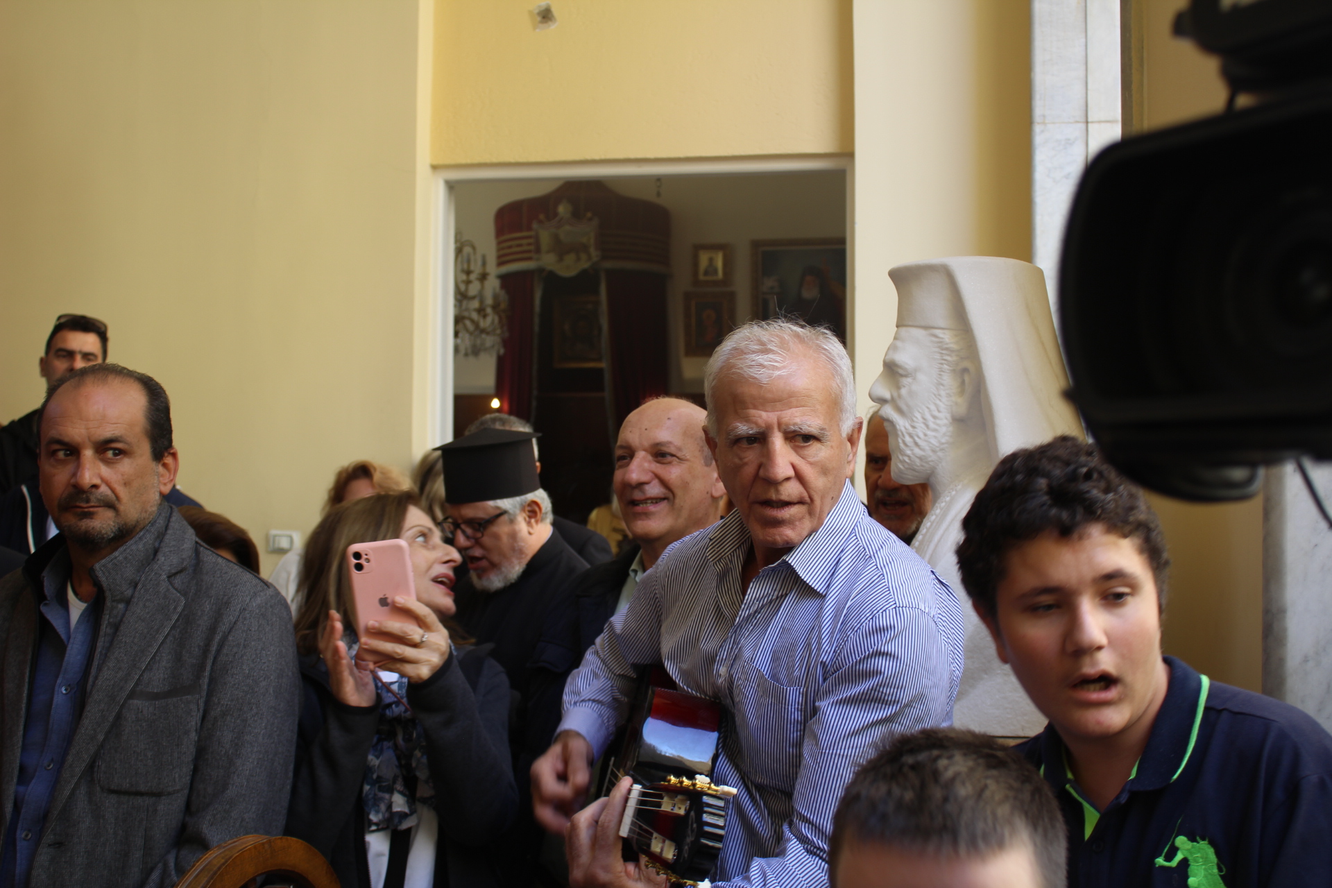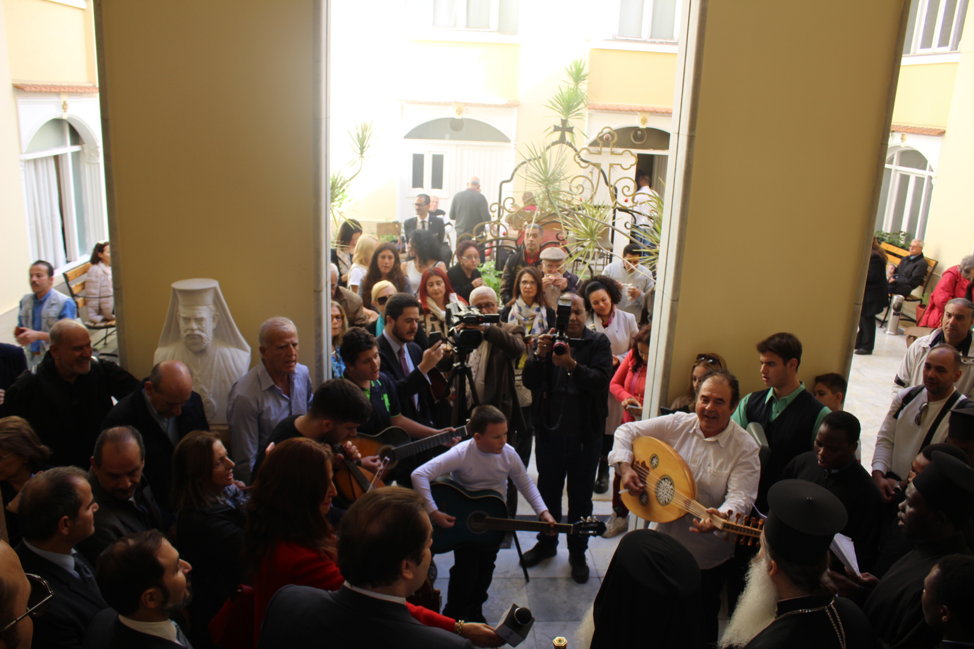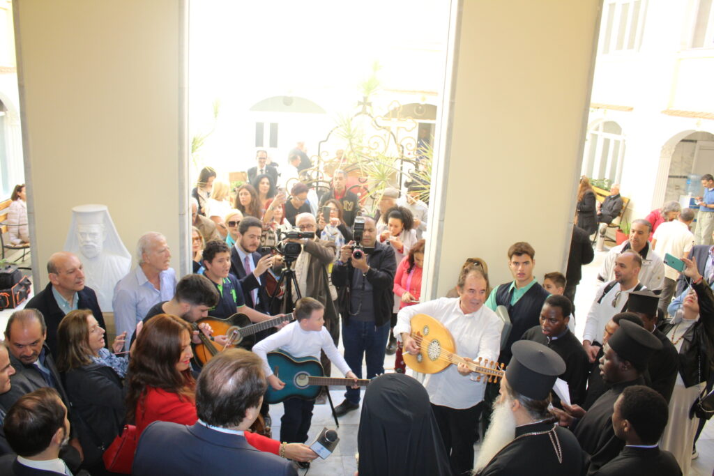 Ευχάριστη η στιγμή κατά την οποία, στα σκαλιά του προαύλιου χώρου, μαθητές με τον εκπαιδευτικό κ. Νικόλαο Χατζησκάκη επικεφαλής, και τον ιεροψάλτη κ. Ιωάννη Γενιατάκη έπαιξαν με κιθάρες και λύρες και τραγούδησαν προς χάριν του Μακαριωτάτου και του κ. Υπουργού!