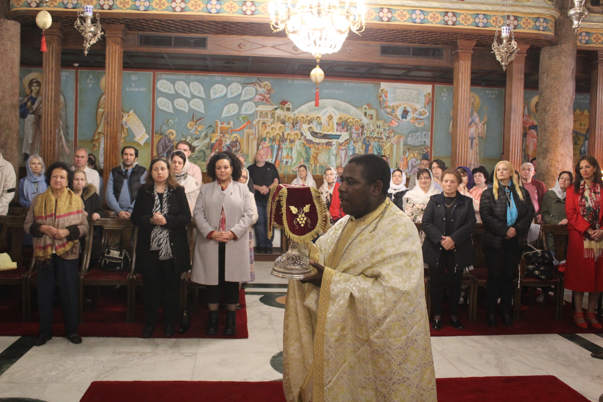 Στην θεία Λειτουργία χοροστάτησε ο Πάπας και Πατριάρχης Αλεξανδρείας και πάσης Αφρικής κ. Θεόδωρος Β’, με έκδηλη χαρά ένεκα του γεγονότος, ότι παρίστατο εντός του Ναού ο Έλληνας Υπουργός.
