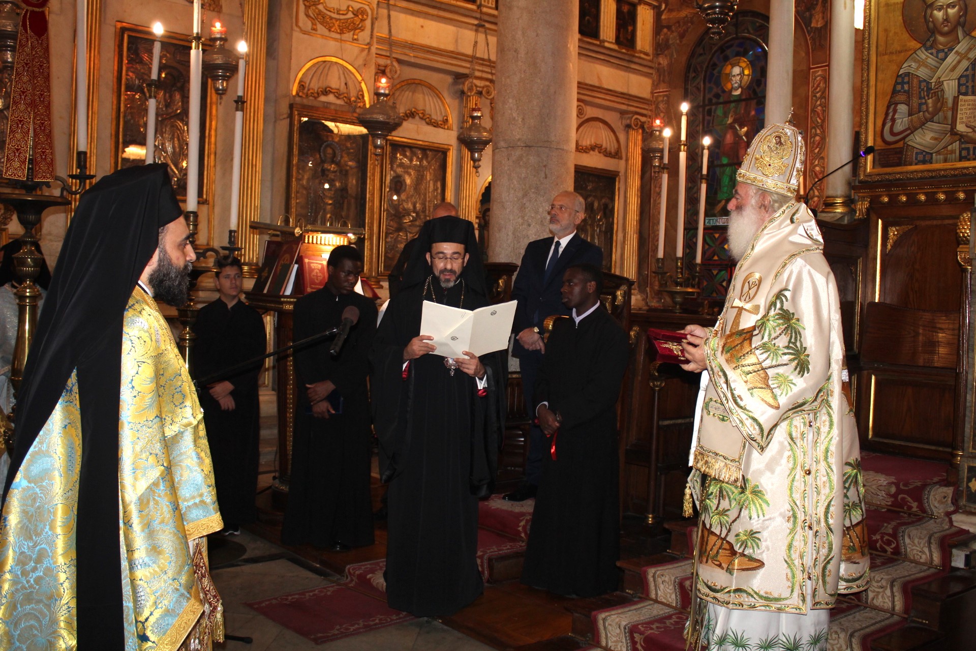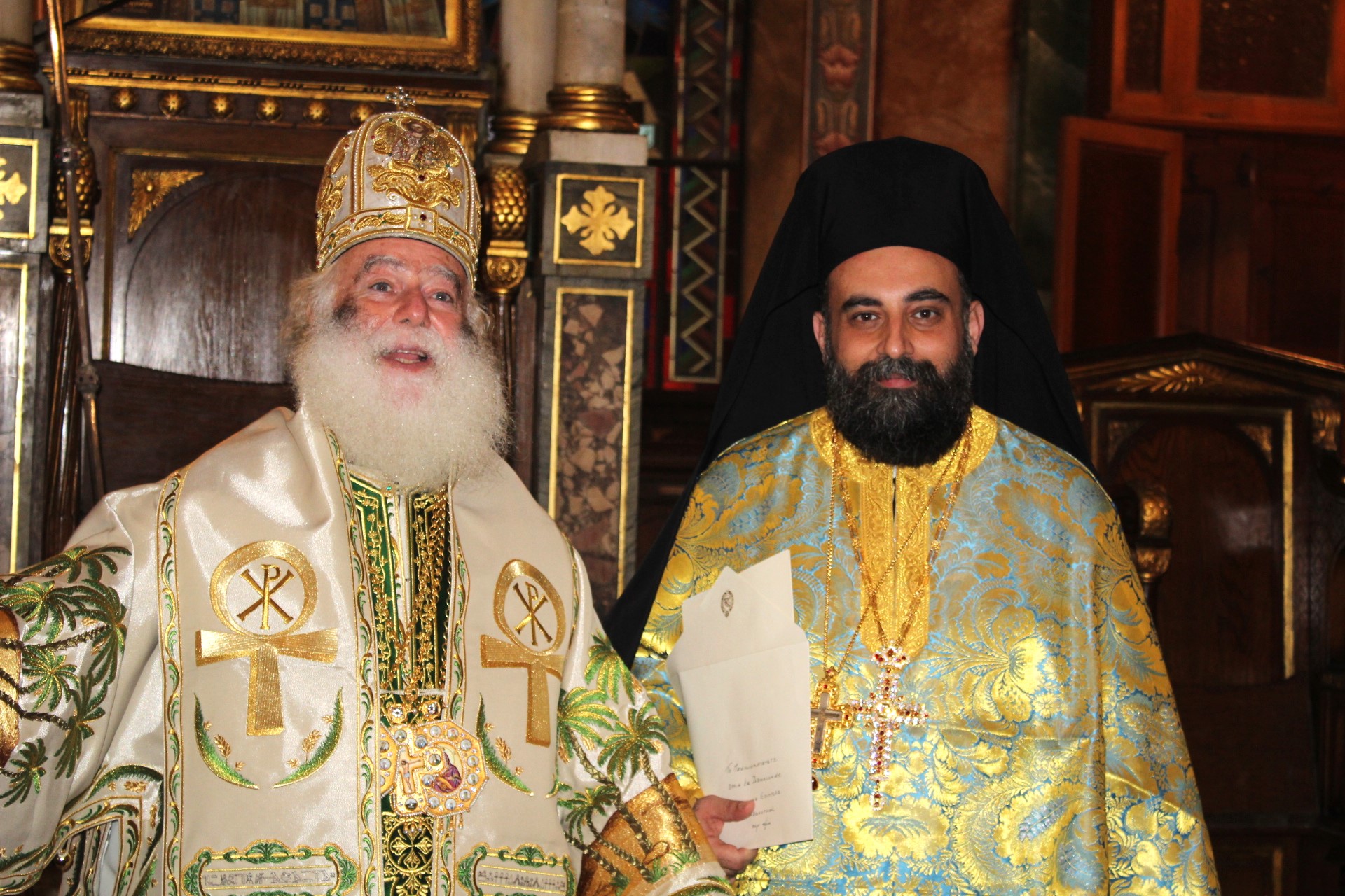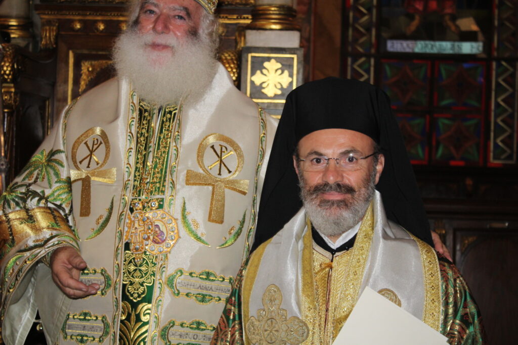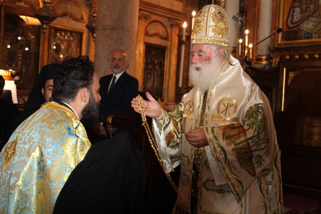 Επίσης, ανακοίνωσε την απονομή του εκκλησιαστικού αξιώματος «τοῦ Ἀποκρισιαρίου τοῦ Πρεσβυγενοῦς Πατριαρχείου Ἀλεξανδρείας, πάσης γῆς Αἰγύπτου καί πάσης Ἀφρικῆς παρά τοῖς Παλαιφάτοις Πατριαρχικοῖς Θρόνοις Ἀντιοχείας τε και Ἱεροσολύμων και παρά τάς λοιπάς Χριστιανικάς Ἐκκλησίας ἐν τῇ χειμαζομένῃ ὑπό πολεμικῶν ἐχθροπραξιῶν Μέσῃ Ἀνατολῇ», σύμφωνα με το κατωθι σχετικό Πατριαρχικό Ευεργετήριο Γράμμα, το οποίο ανέγνωσε προς το Χριστεπώνυμο Πλήρωμα ο Σεβασμιώτατος Μητροπολίτης Πτολεμαΐδος κ. Παντελεήμων, Αρχιγραμματεύς και Μέλος της Αγίας και Ιεράς Συνόδου του παλαιφάτου Πατριαρχείου:
