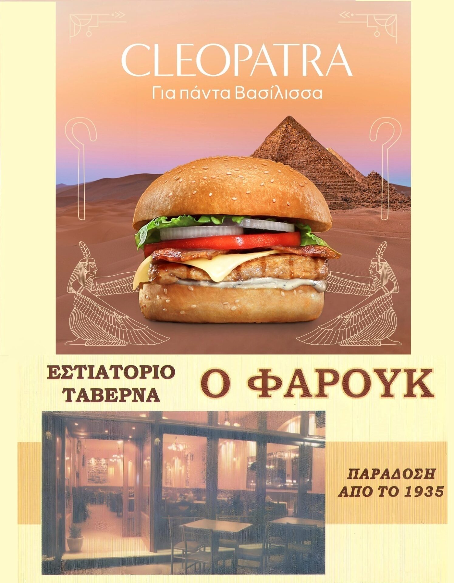 Τέλος, πρέπει να αναφερθεί το Burger ¨The Cleopatra¨, από το εστιατόριο ¨Simply Burgers¨, που όπως αναφέρεται είναι ένα burger που εμπνεύστηκαν από το πάθος της Βασίλισσας Κλεοπάτρας και του Μάρκου Αντώνιου, για να απολαύσει ο καταναλωτής μια γεύση που θα του μείνει αξέχαστη, όπως και η ιστορία τους. Περιέχει κοτόπουλο φιλέτο στη σχάρα, έμενταλ, μπέικον, παρμεζάνα και αυθεντική Caesar σως