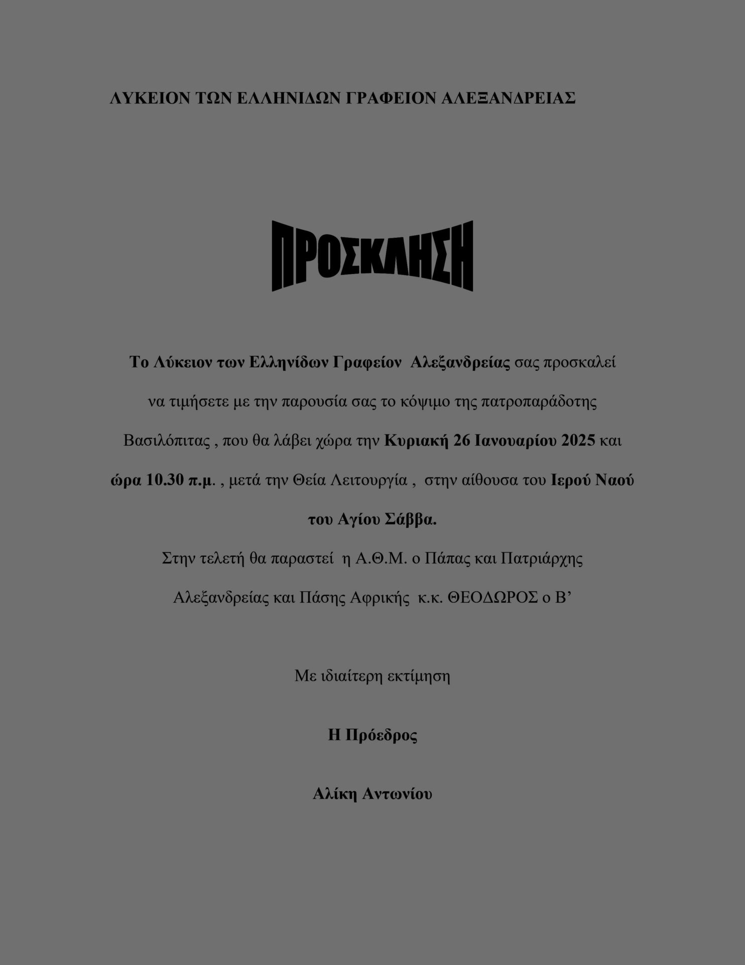 Το Λύκειον των Ελληνίδων Γραφείον Αλεξανδρείας σας προσκαλεί