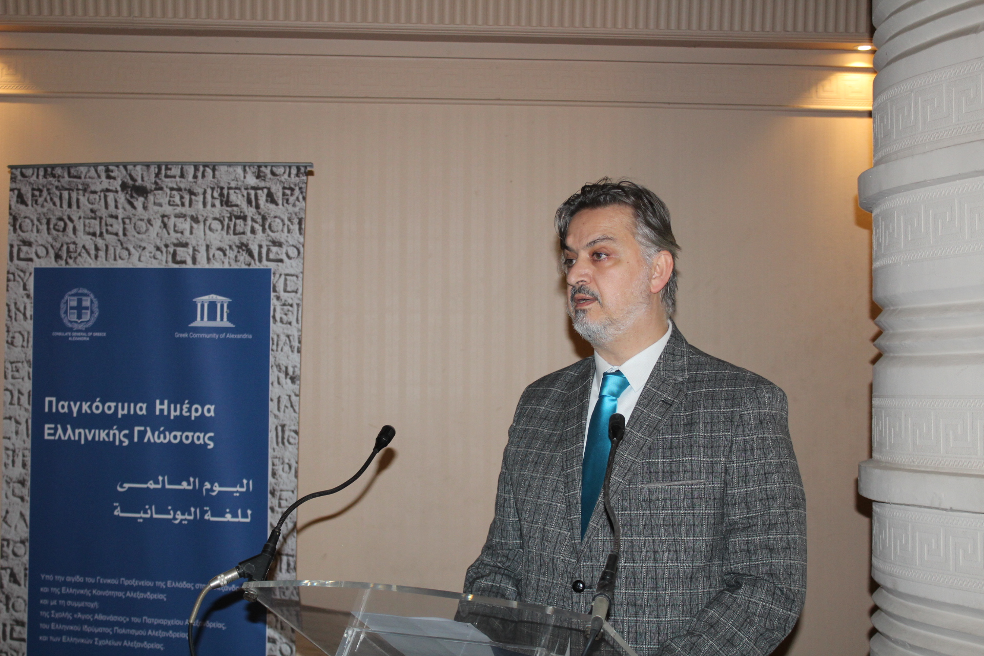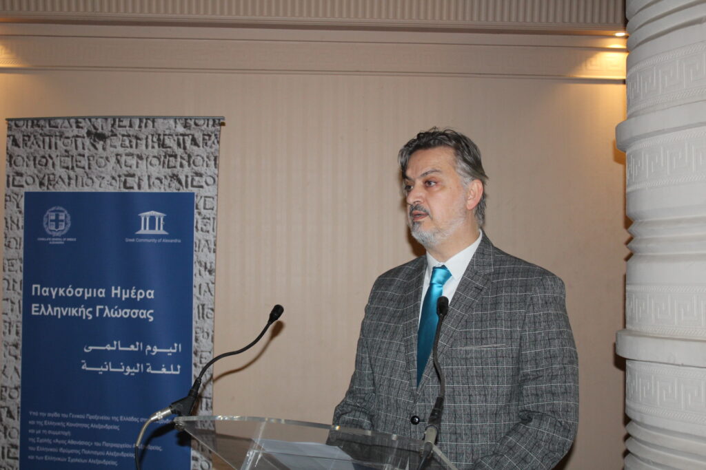 Ακολούθησε ο Γενικός Πρόξενος της Ελλάδας στην Αλεξάνδρεια κ. Ιωάννης Πυργάκης, ο οποίος διάβασε το μήνυμα του Υφυπουργού Εξωτερικών κ. Γιώργου Κώτσηρα, όπου ανάμεσα σε πολλές άλλες σημαντικές αναφορές, εξέφρασε τα παρακάτω: «Ο εορτασμός για την Παγκόσμια Ημέρα Ελληνικής Γλώσσας αποτελεί μια μοναδική ευκαιρία να αναλογιστούμε τη σημασία της οικουμενικότητας και της διαχρονικότητας της ελληνικής γλώσσας. Μιας γλώσσας αδιάκοπα ομιλούμενης επί αιώνες, η οποία είναι η κιβωτός της ελληνικής ταυτότητας στον χρόνο. Μιας γλώσσας με μοναδική συμβολή στον παγκόσμιο πολιτισμό, στις επιστήμες και τις τέχνες, μιας γλώσσας που ενώνει, ερμηνεύει και νοηματοδοτεί».