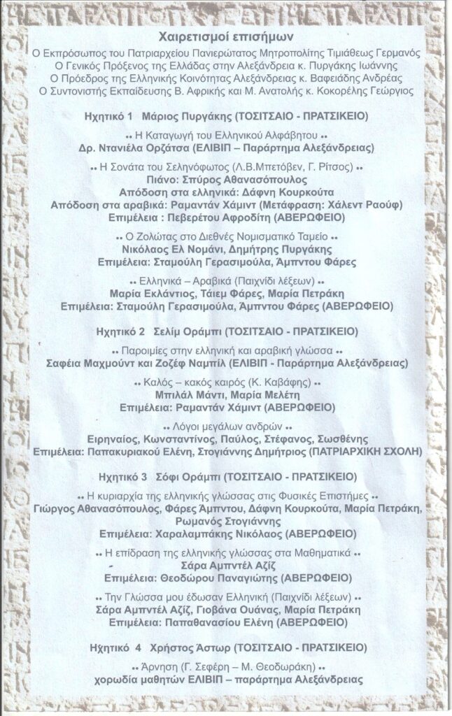 Η όλη εκδήλωση είχε τεθεί υπό την αιγίδα του Γενικού Προξενείου της Ελλάδας στην Αλεξάνδρεια και της Ελληνικής Κοινότητας Αλεξανδρείας, με τη συμμετοχή της Πατριαρχικής Σχολής «Άγιος Αθανάσιος» του Ελληνικού Ιδρύματος Πολιτισμού Αλεξανδρείας και των Ελληνικών Σχολείων Αλεξανδρείας.