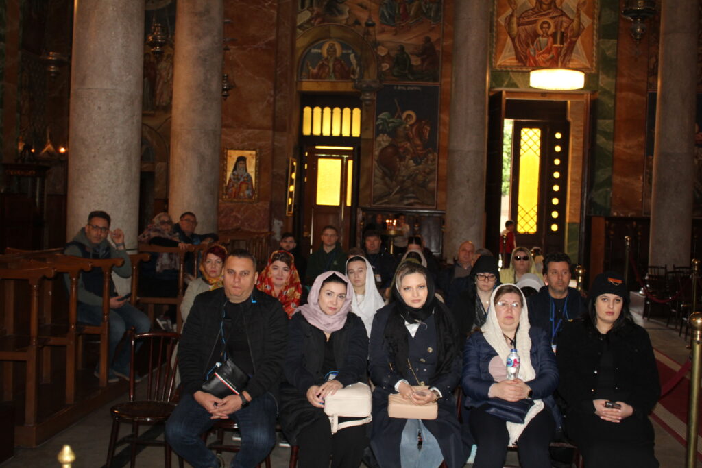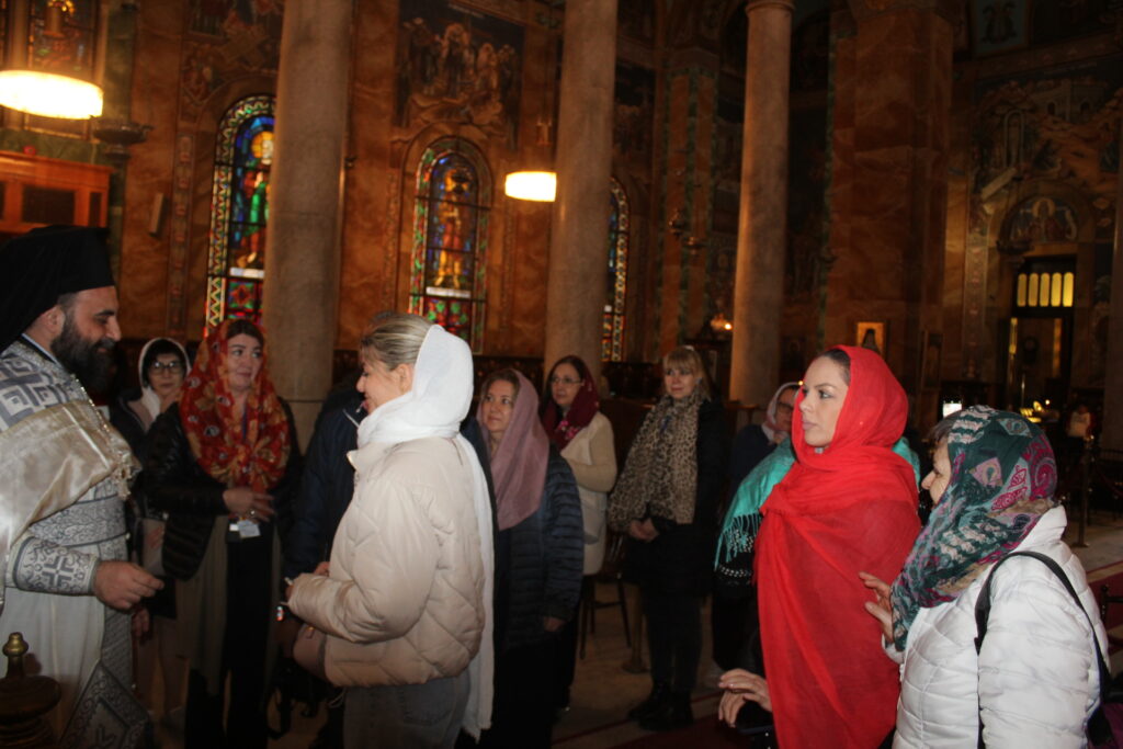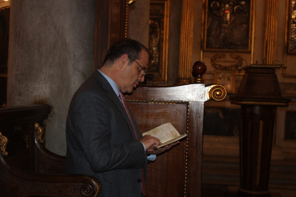 Ο Προέδρος της ΕΚΑ κ. Ανδρέας Βαφειάδης συνομιλώντας με κάποιους εκ των πιστών επισκεπτών, τους ενημέρωσε για την ιστορία του Ευαγγελισμού και τους ευχαρίστησε που τιμούν την Αλεξάνδρεια, τον Ελληνισμό και την Ορθοδοξία. Αυτό ακριβώς για το οποίο αγωνίζεται και προσπαθεί ο Πατριαρχικός Επίτροπος κ. Δαμασκηνός καθότι φροντίζει οι ορθόδοξοι επισκέπτες που πατούν το πόδι τους στην Αίγυπτο, να μη λησμονούν να επισκέπτονται το Πατριαρχείο και να προσεύχονται στον Ιερό Καθεδρικό Ναό της χριστιανοσύνης.