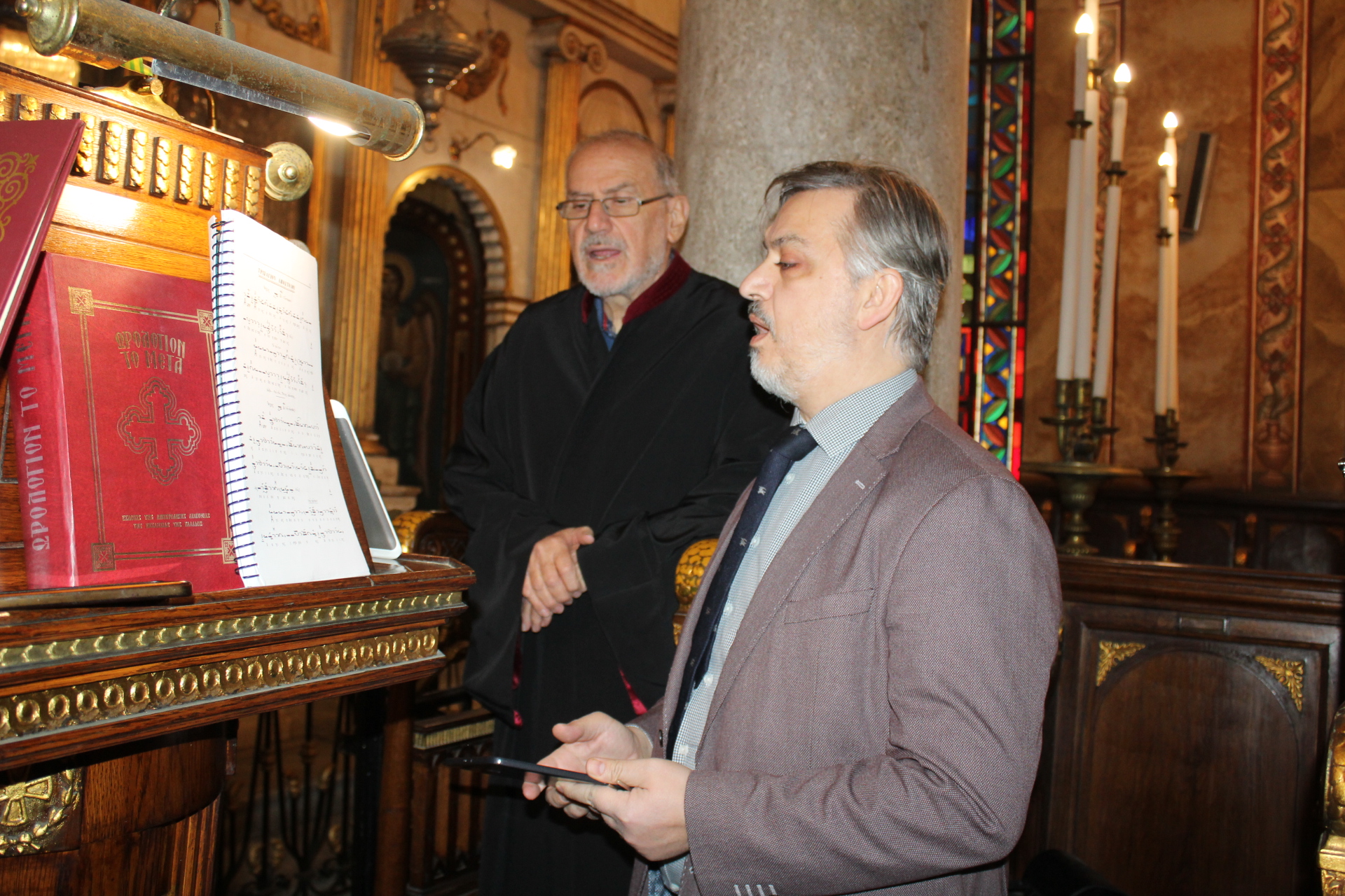 Στο ψαλτήρι οι ύμνοι της Ορθοδοξίας απεδόθησαν απ΄ τον καλλικέλαδο μουσικό και ιεροψάλτη κ. Ιωάννη Γενειατάκη, με μαθητές της Πατριαρχικής Σχολής «Άγιος Αθανάσιος» και τη συνδρομή του υιού του Αναστασίου Γεννειατάκη.