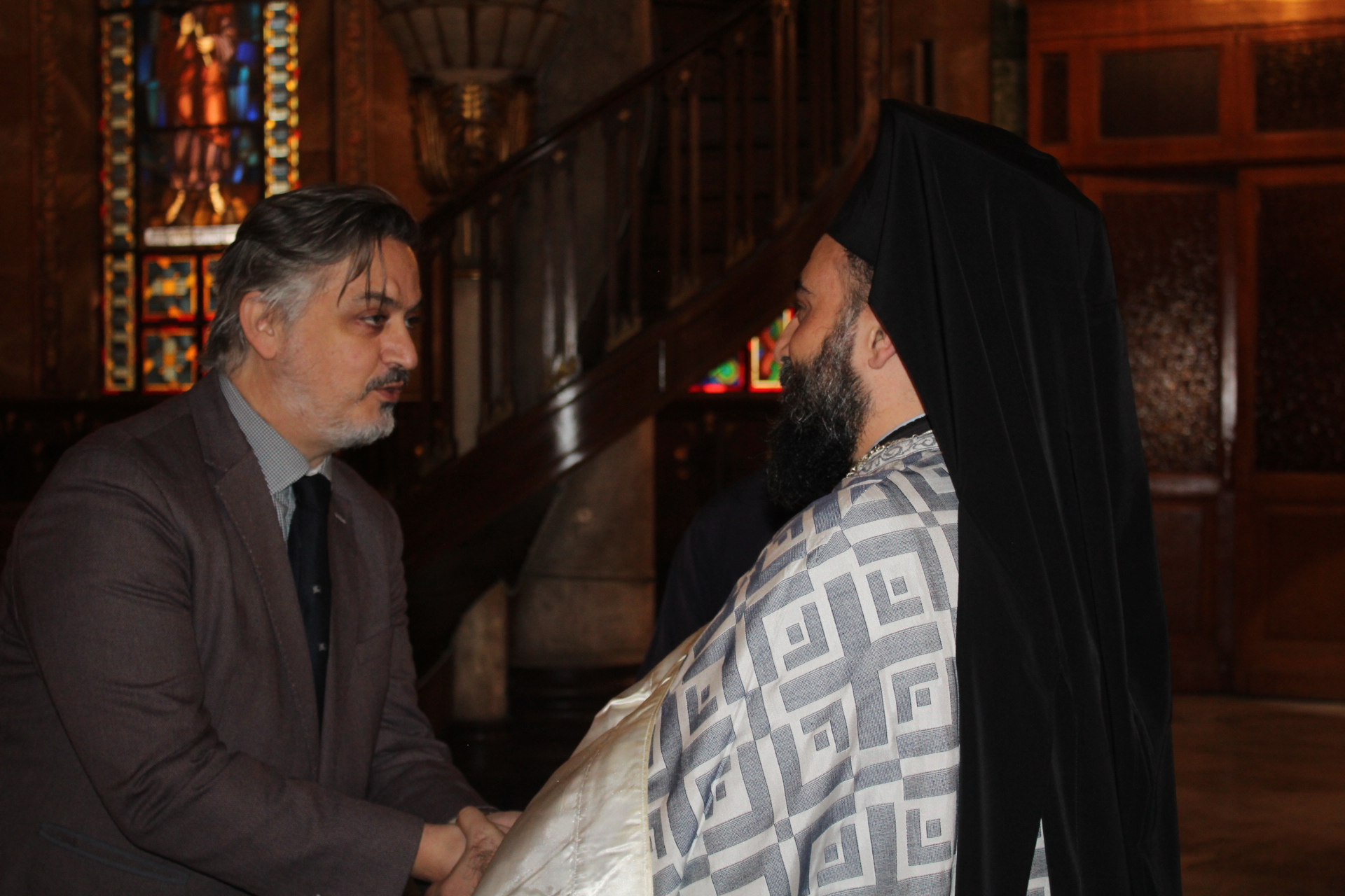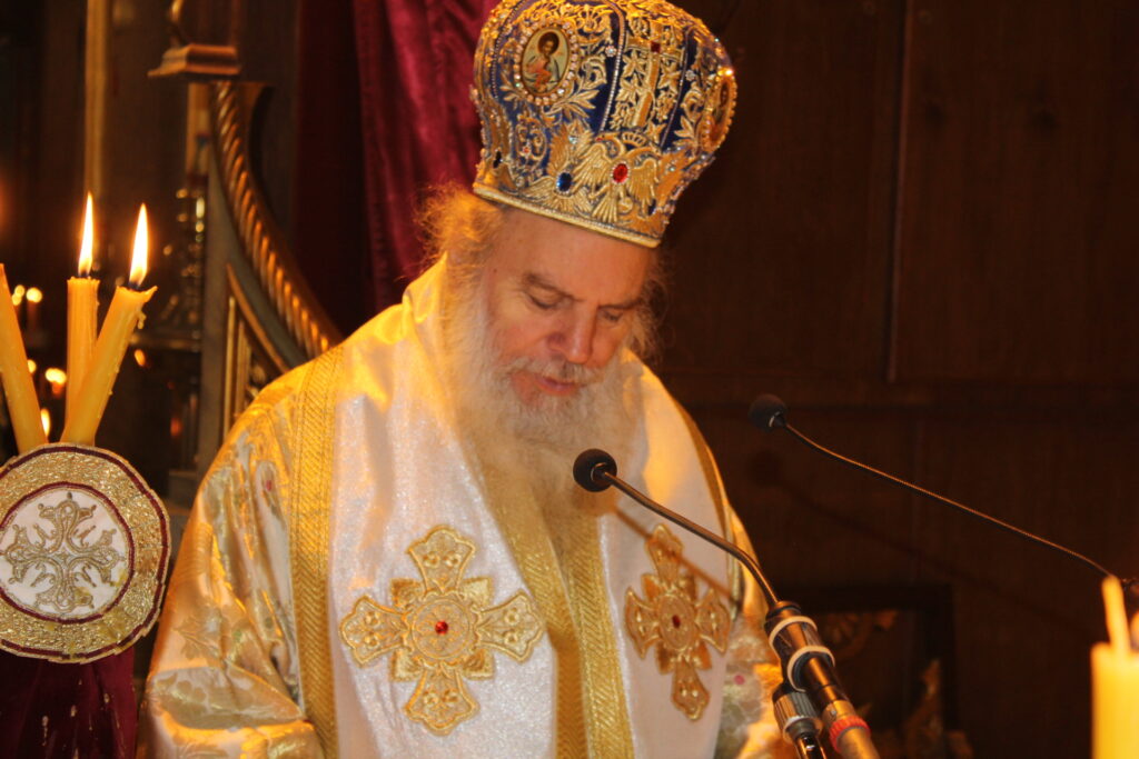 «Ο Μακαριώτατος σας μεταφέρει τις ευχές του και έχετε την ευλογία του,  διότι όπως γνωρίζετε βρίσκεται στο ιεραποστολικό του ταξίδι στην Αφρική, επισκεπτόμενος την Κένυα, την Τανζανία και το Νότιο Σουδάν, όπου επί σειρά ετών αγωνίζεται για την καλυτέρευση των συνθηκών ζωής των χειμαζόμενων λαών της ηπείρου του μέλλοντος, όπως ο ίδιος την αποκαλεί. Μέσα από αυτά τα κοπιώδη ταξίδια του, θεμελιώνει νοσοκομεία, σχολεία, ναούς και δείχνει την χριστιανική αγάπη του με κόπο και θυσίες δημιουργώντας καλύτερες προϋποθέσεις για τους δυστυχείς συνανθρώπους μας. Είναι ένα έργο το οποίο αποδίδει καρπούς, ο δε ιεραποστολικός του αγώνας συγκινεί όλους μας. Επίσης να τονίσω τις αγαστές σχέσεις και την αλληλοεκτίμηση που έχουν μεταξύ τους ο Μακαριώτατός μας, με τον Πατριάρχη της Ρουμανίας κ. Δανιήλ. Θέλω να σας ευχαριστήσω που σήμερα παρευρίσκεσθε εδώ με τους σεβάσμιους ιερείς που σας συνοδεύουν, όπως επίσης για  την ευλάβεια με την οποία συμμετείχατε εις την Θεία Λειτουργία και σας εύχομαι καλή επιστροφή στην πατρίδα σας και με την αγάπη του Χριστού μας να έχετε υγεία, ειρήνη και ευημερία.»